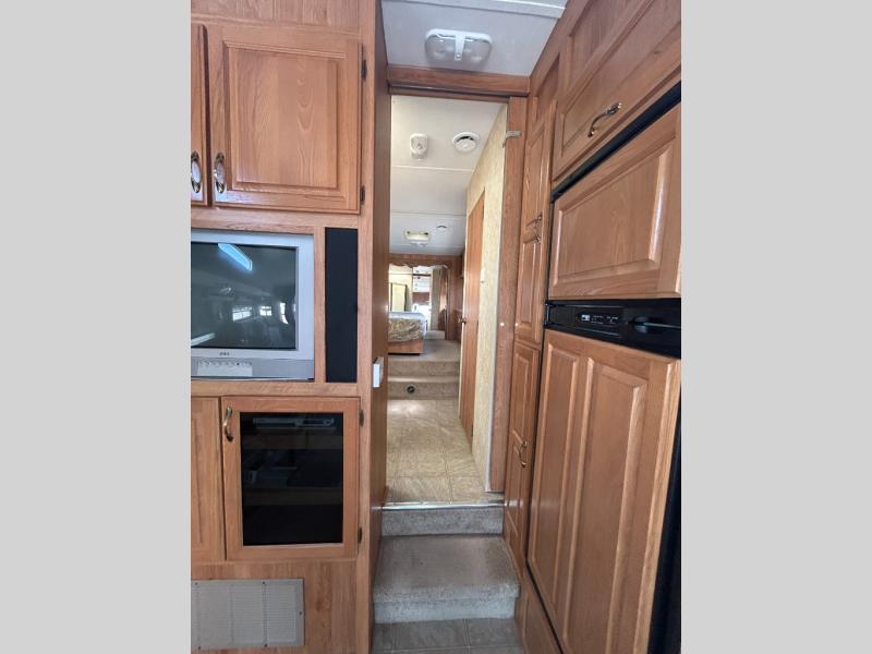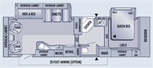 Double Slide, Rear Living Space w/2 Chairs, Hide-A-Bed Sofa, Dinette w/Opt. Extendable Seating, or Free Standing Table & Chairs, Ent. Center, Double Kitchen Sink, 3 Burner Range/Microwave Above, Refrigerator, Pantry, Overhead Cabinets, Angle Shower, Wardrobe, Queen Bed, Chest, TV, Wardrobe, and More