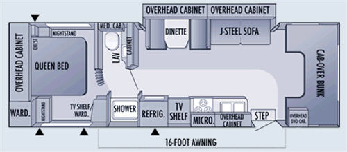 Single Slide, Queen Bed, Nightstand, TV Shelf/Wardrobe, Overhead Storage Cabinets, Shower, Refrigerator, TV Shelf, Microwave, 3 Burner Range, Double Kitchen Sink, Dinette, J-Steel Sofa, Bunk Over Cab or Entertainment Center Opt. and More.