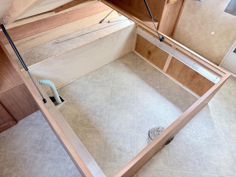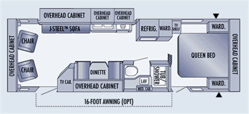 Rear Living Space w/2 Chairs, TV Cabinet, J-Steel Sofa, Dinette, Double Kitchen Sink, Refrigerator, Wardrobe, TV Shelf, Tub/Shower, Queen Bed, Outside Bedroom Entrance and More.
