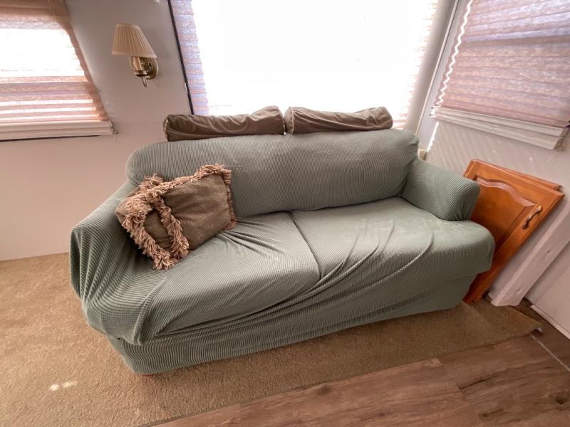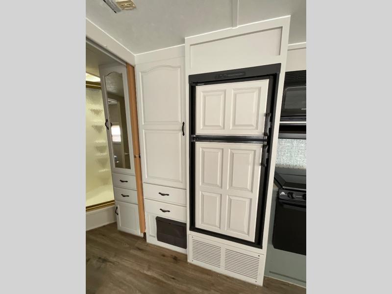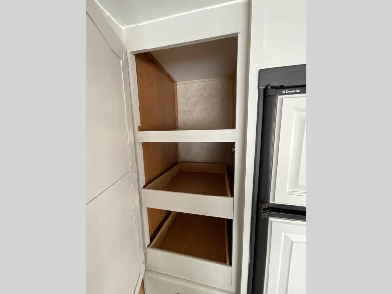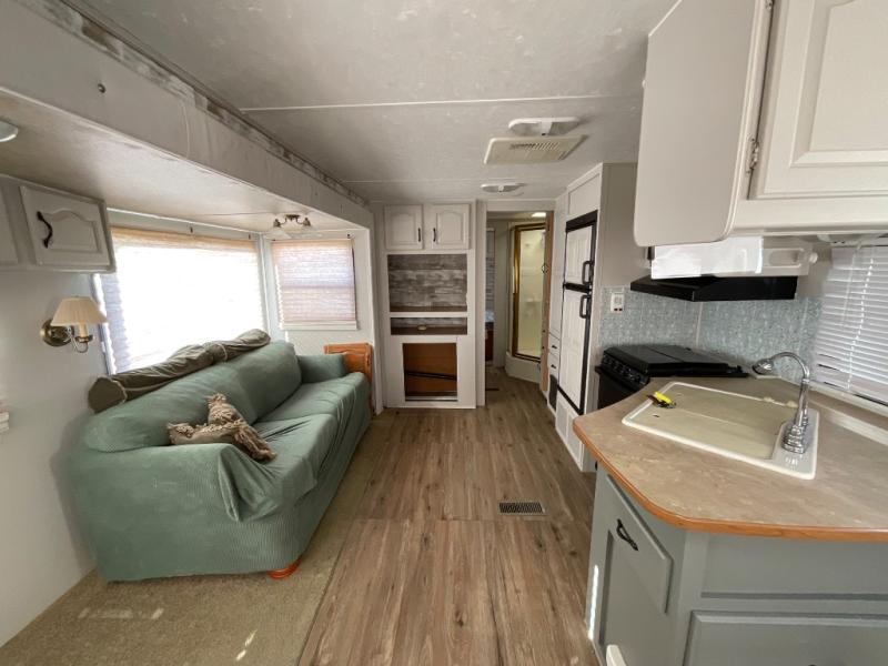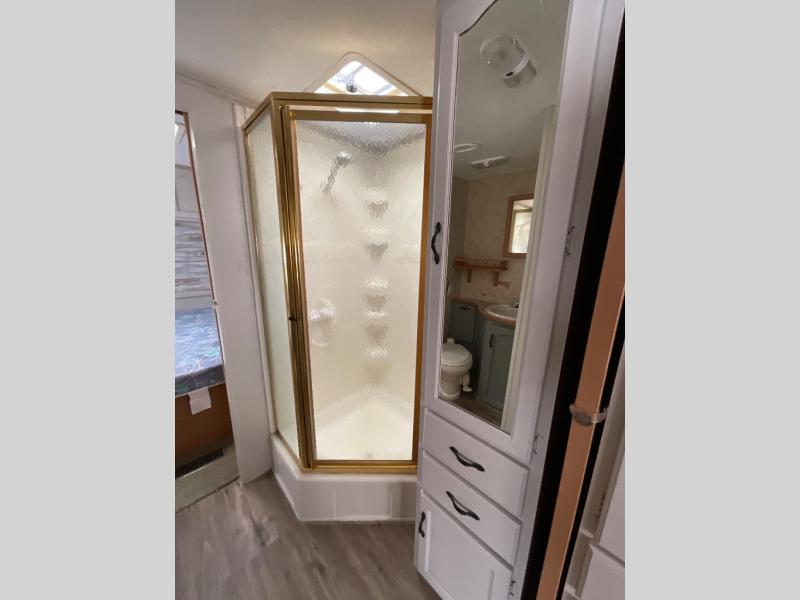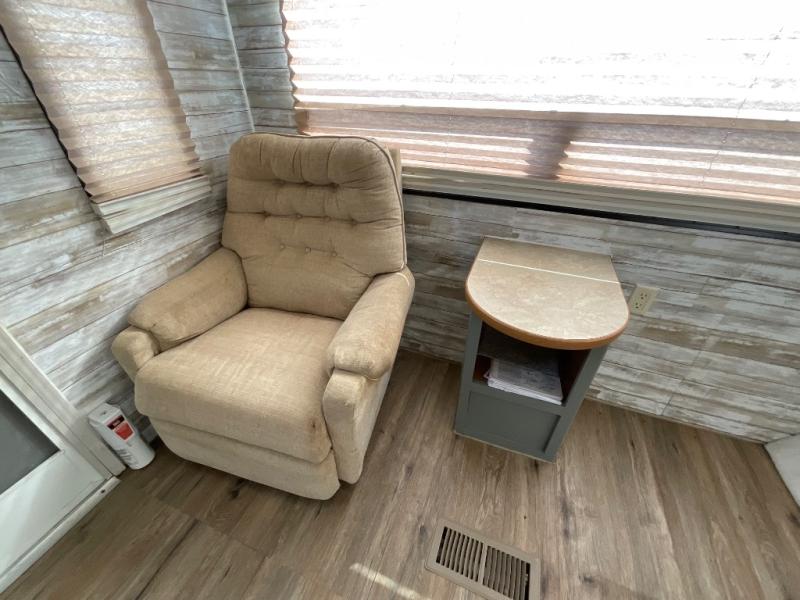 Single Slide, Rear Living Area w/2 Easy Chairs & End Table, Sofa Bed, Booth Dinette & TV Area w/Wardrobe, Dbl. Kitchen Sink, Microwave, 3 Burner Range, Refrigerator, Pantry, Wardrobe, Angle Shower, Lav., Front Queen Bed w/Shirt Closets, TV Shelf & Laundry Chute, Pass-Through Storage, and Much More!