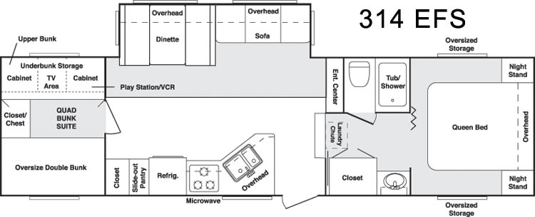 Neo-Angle Shower, TV/Linen Closet, Queen Bed, Oversized Storage, Ent. Center, Laundry Chute, Residential Kitchen Sink, Microwave, Refer, Slide-out Pantry, Underbunk Storage, Oversized Double Bunk, Quad Bunk Suite, and So Much More!