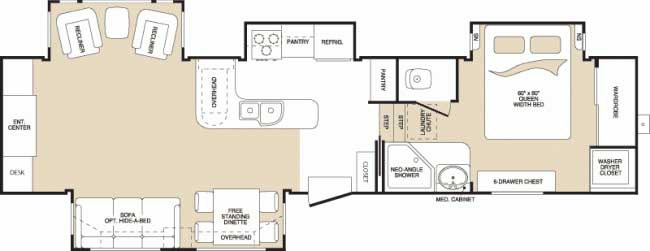 Quad Slide w/Rear Living Area, 2 Recliners, Ent. Center, Desk, Sofa or Hide-A-Bed, Free Standing Dinette, L-Shaped Counter w/Double Kitchen Sink, Pantry, Refrigerator, 3 Burner Range, Angle Shower, Seperate Stool Room, Laundry Chute, Washer/Dryer Closet, Queen Bed, Nightstands, Chest and Much More.