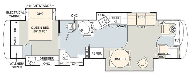 Triple Slide, Rear Wardrobe, Wash/Dryer, Elect. Cabinet, Queen Bed Slide w/Nightstands, Dresser, TV, Hutch, Vanity, Seperate Stool Room, Shower, 2nd Hutch, Double Kitchen Sink, Refrigerator, 3 Burner Range w/Micro., Sofa, Round Dinette w/Chairs, Barrel Chair, TV Above Cab Area & More.