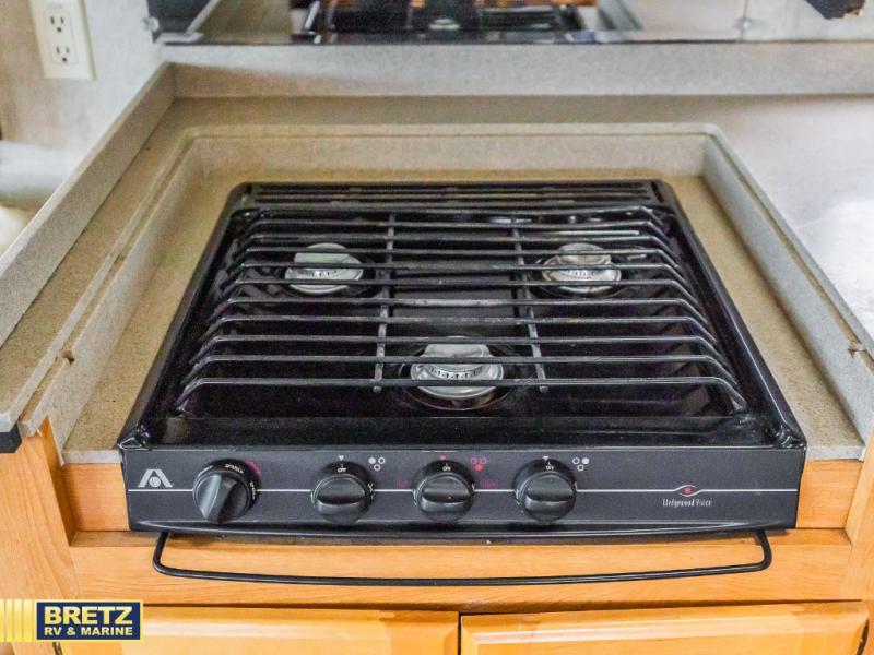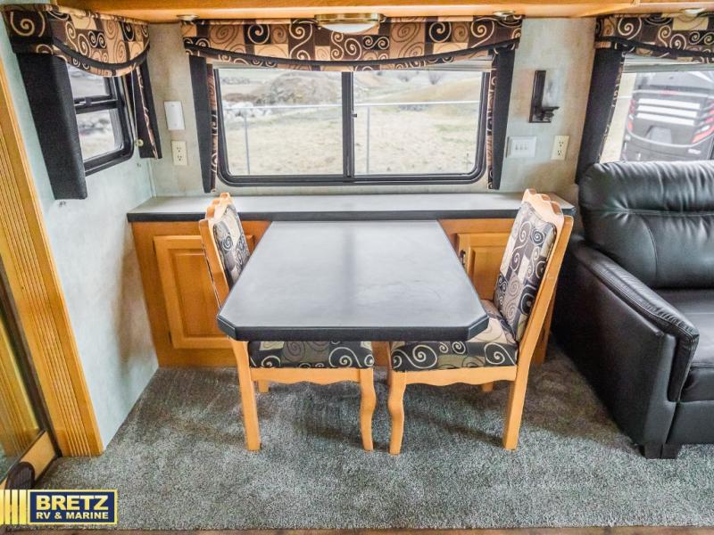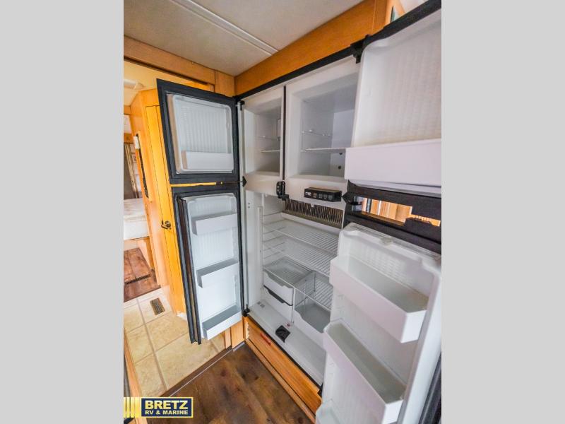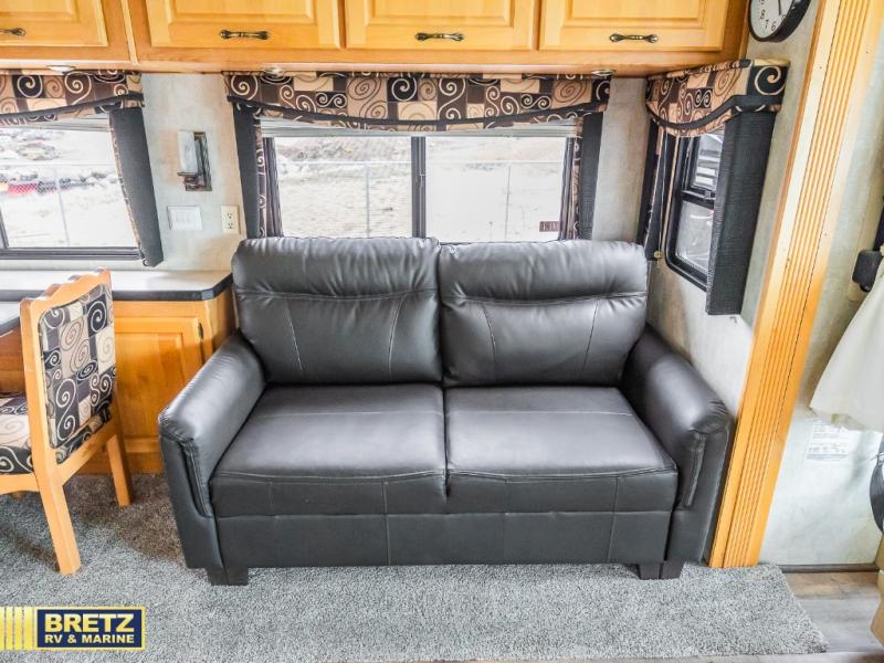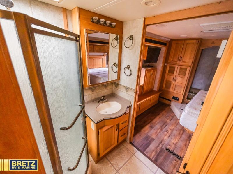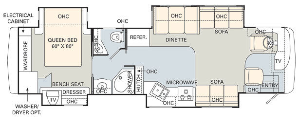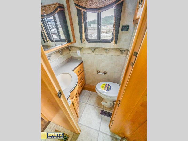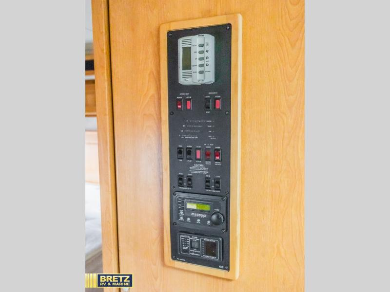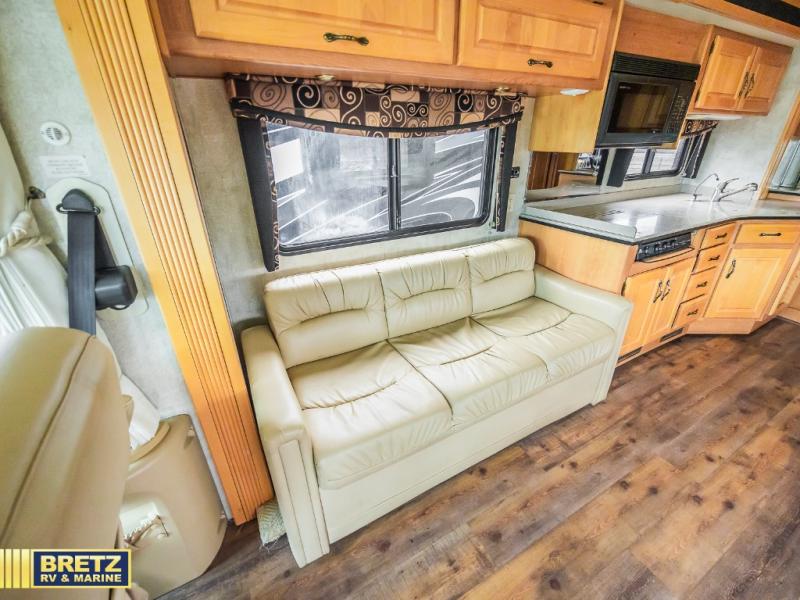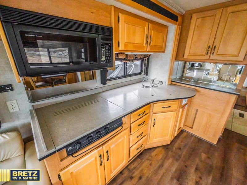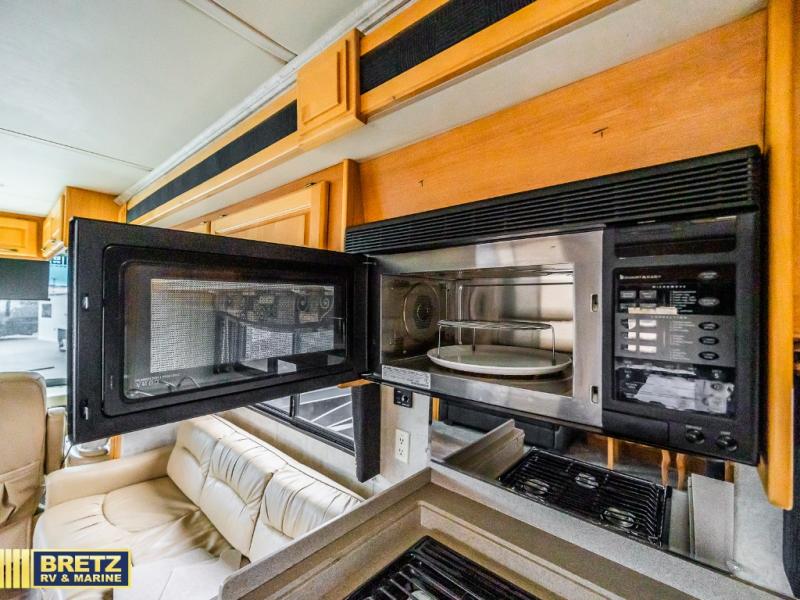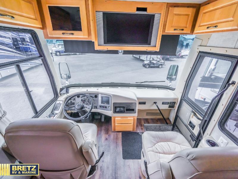 NICE USED CLASS A!!Quad Slide, Rear Ward. w/Electrical Cab., Wash/Dryer Opt., Bench Seat, Dresser/TV w/Overhead Cabinet, Seperate Stool Room, Angle Shower, Refrigerator, Hutch w/Overhead Storage Cab., Sink, Microwave, 3 Burner Range, 2 Sofas, Booth Dinette, TV Above Cab Area and More.