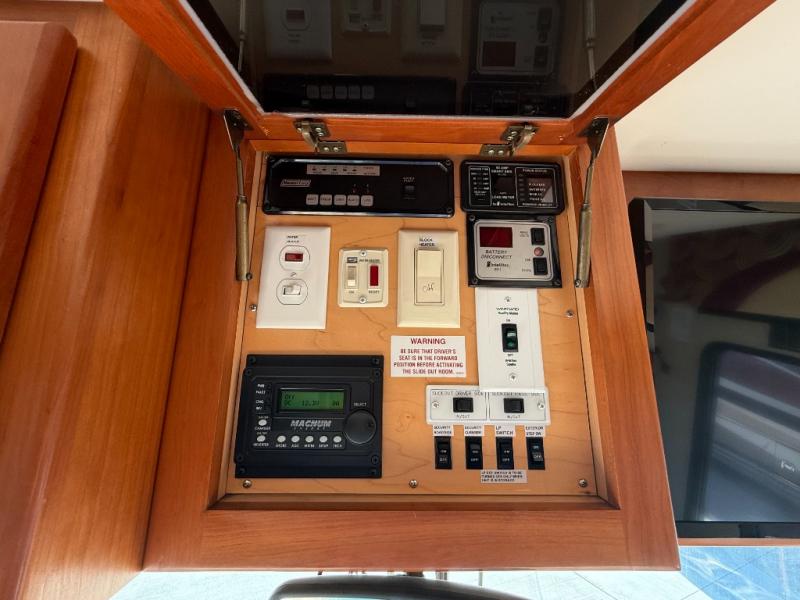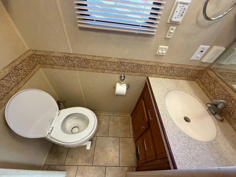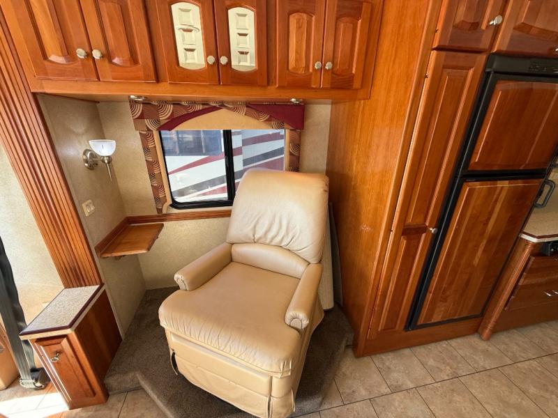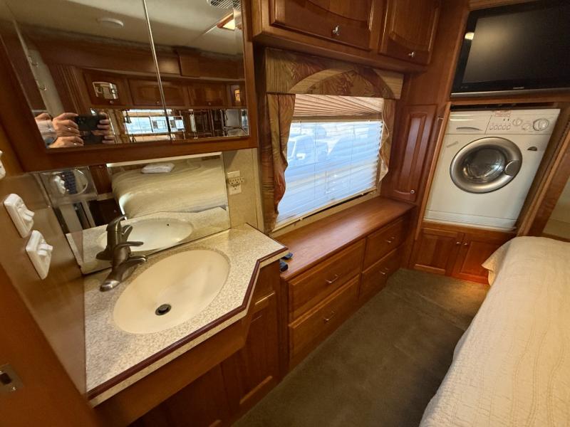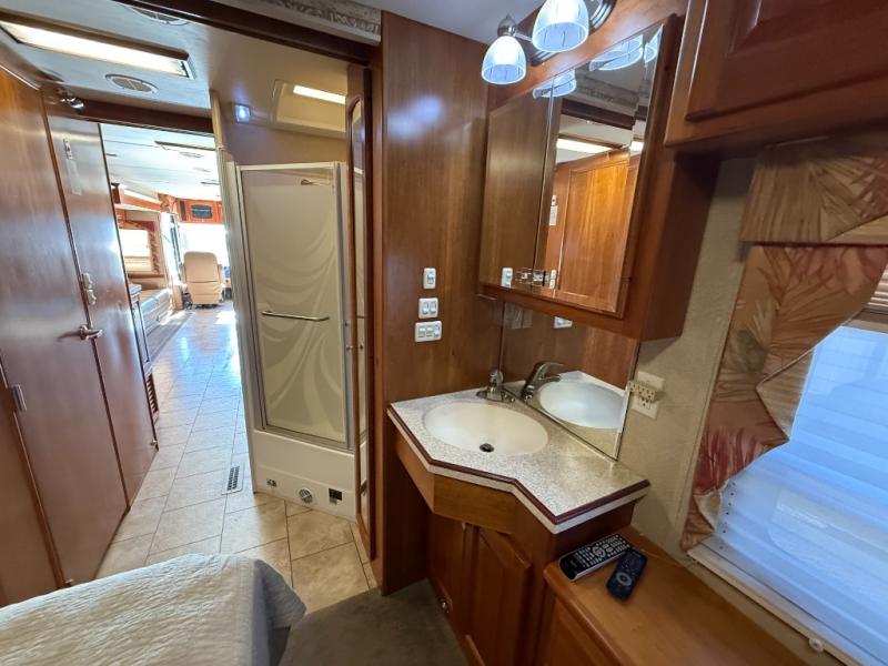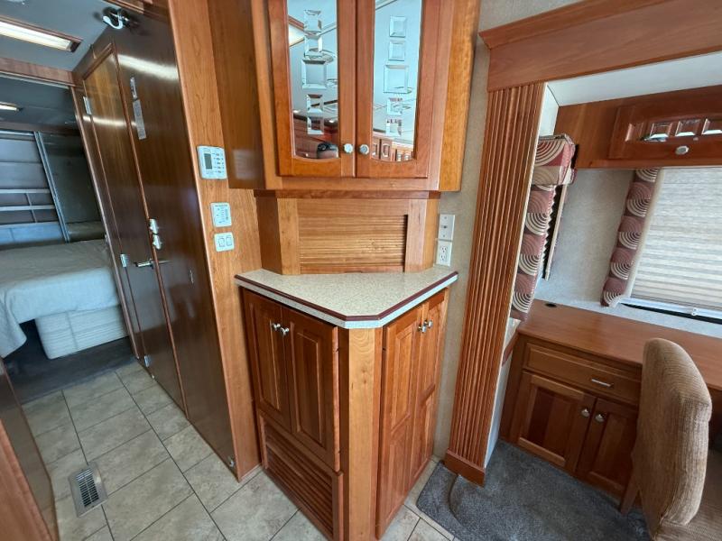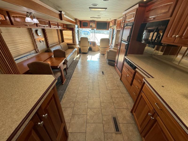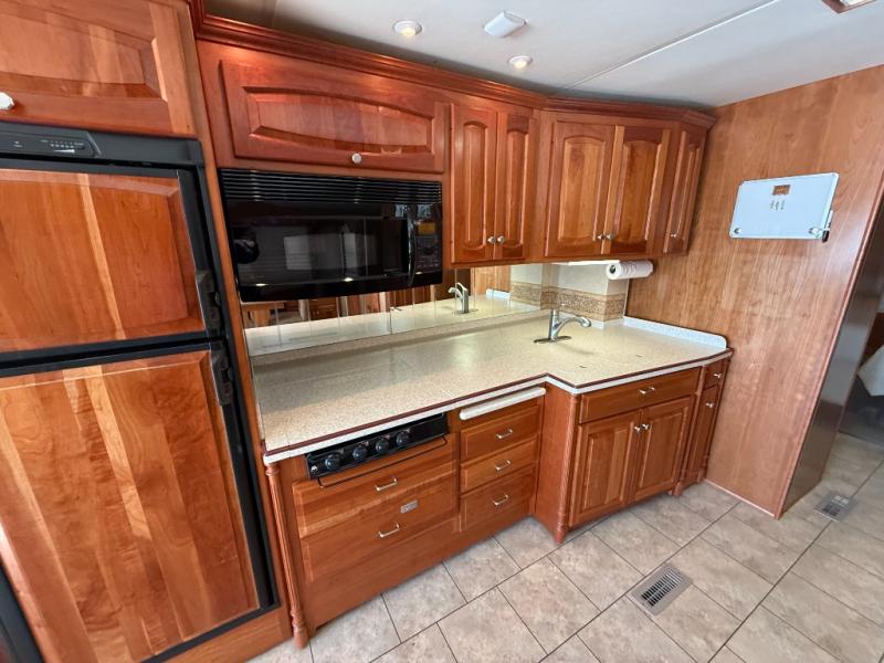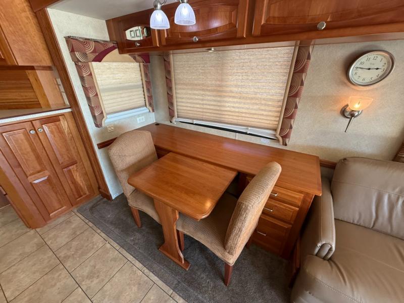 Inside, you’ll find solid wood cabinetry, Corian countertops, and ceramic tile flooring that still stand out nearly two decades later. The spacious quad-slide floorplan creates an open living area featuring a large sofa, recliner, freestanding dinette, and entertainment center. The kitchen offers residential-style appliances, convection microwave, and plenty of storage for extended trips.