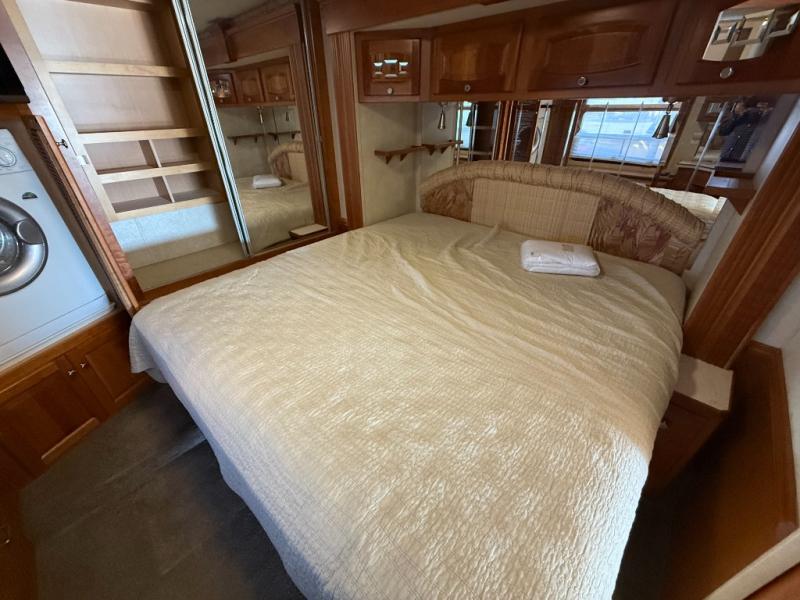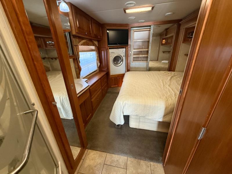 The rear master suite includes a queen bed, full wardrobe, dresser, and private bath with glass-enclosed shower. Climate is handled by dual A/C units and a powerful diesel furnace for year-round comfort.