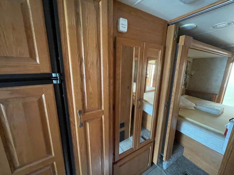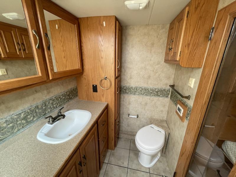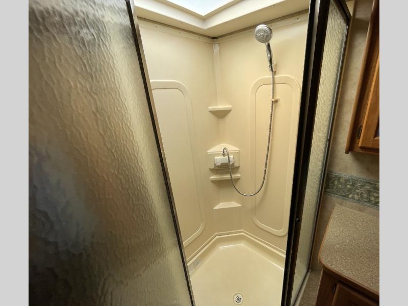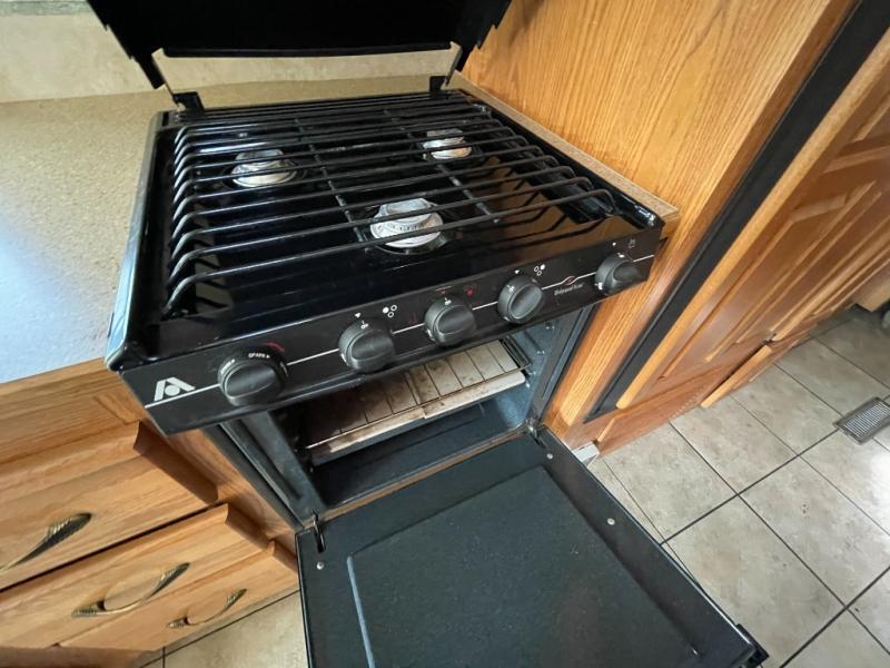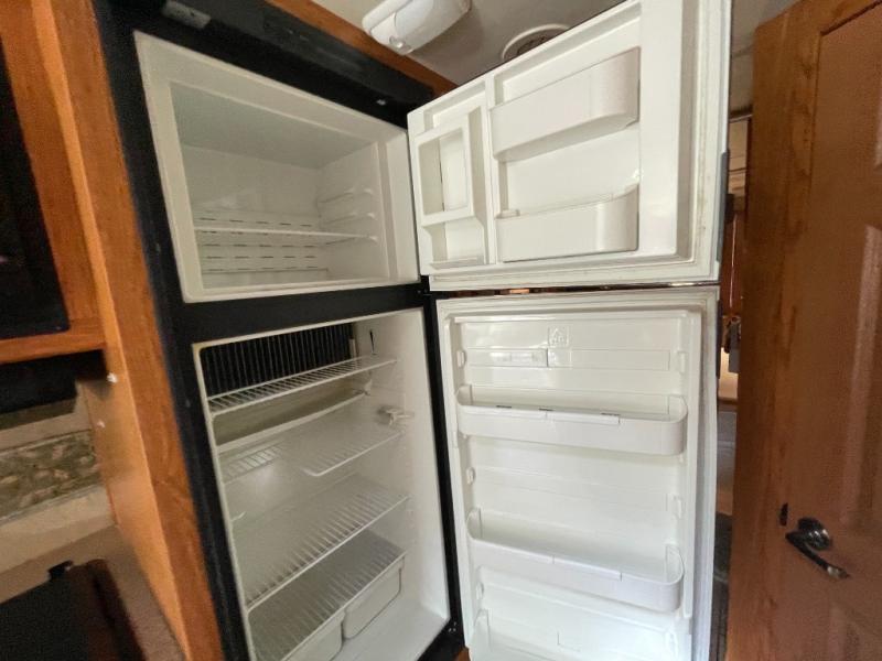 The kitchen layout provides plenty of counter space and storage, making meal prep easy whether you’re cooking at a campground or parked for an extended stay. The bedroom offers privacy and generous storage, while the bathroom setup adds everyday convenience for full-time or seasonal travel.