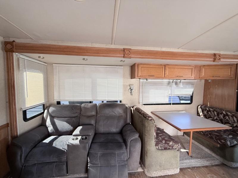 Double Slide, Queen Bed, Nightstands w/Drawers Above One Side, Wardrobe w/Built-In TV Cabinet Above, Desk/Vanity w/Stool, Angle Shower, Ent. Center w/27 In. TV, Lounge Chair, Sofa Bed or Rest Easy Sofa, End Table, Dining Table & Chairs, Kitchen Sink, 3 Burner Range, Pantry, Refrigerator, and More.