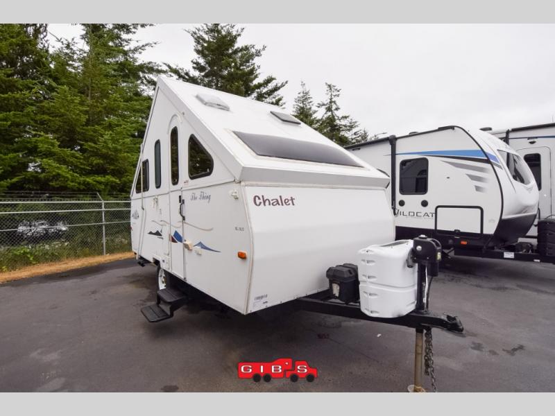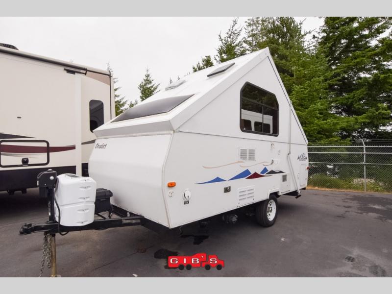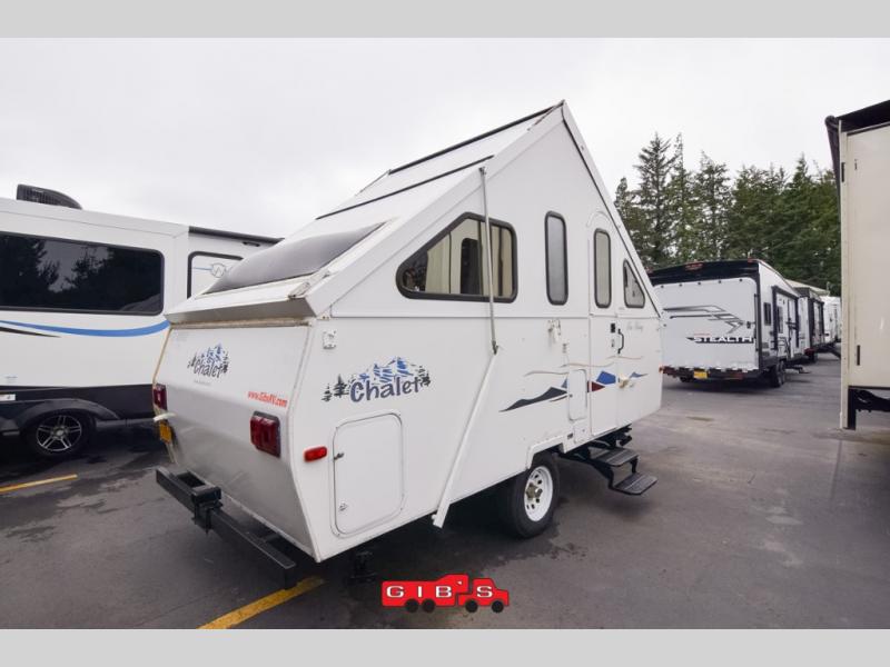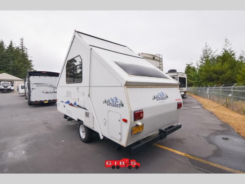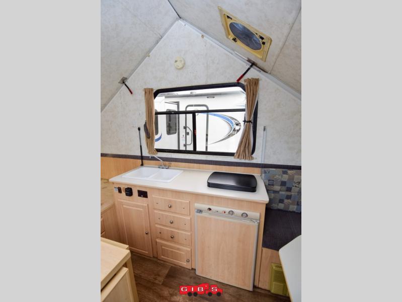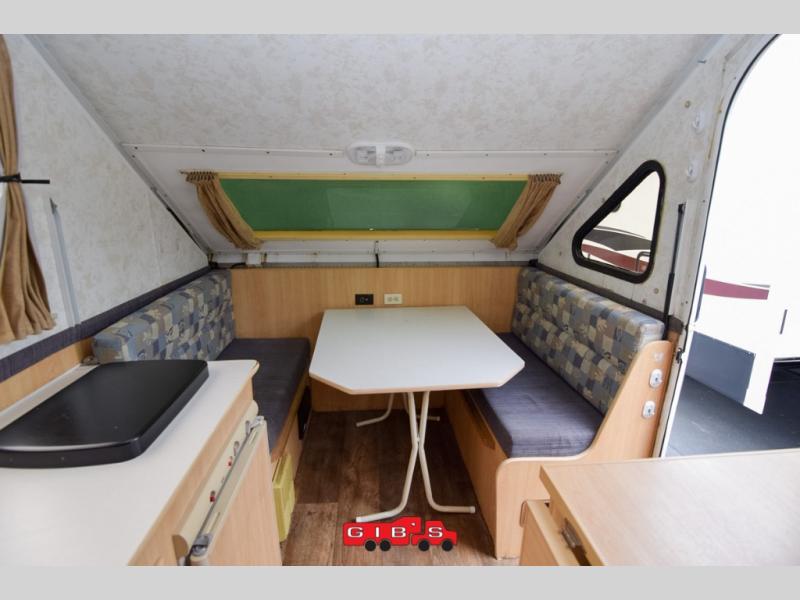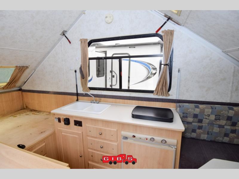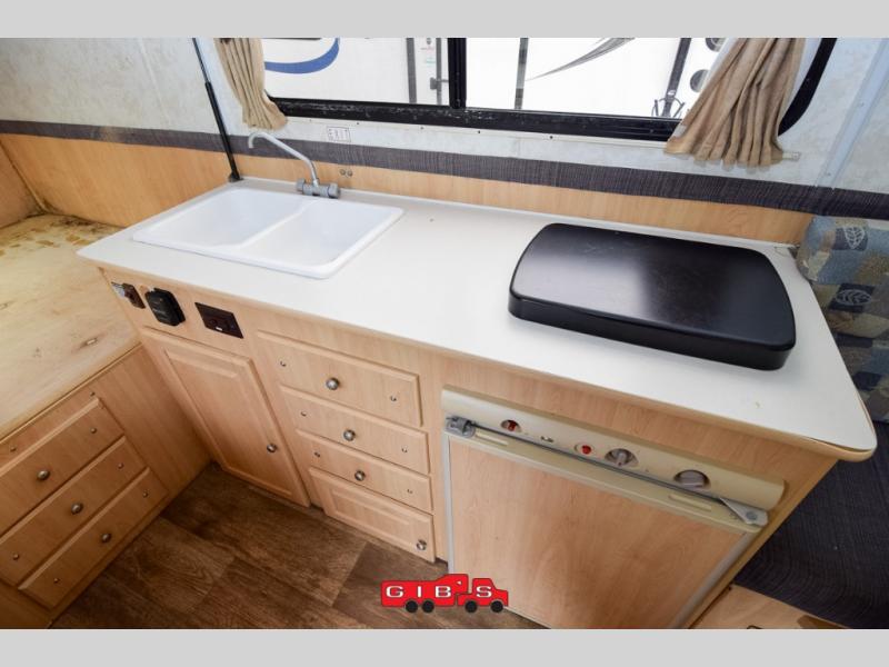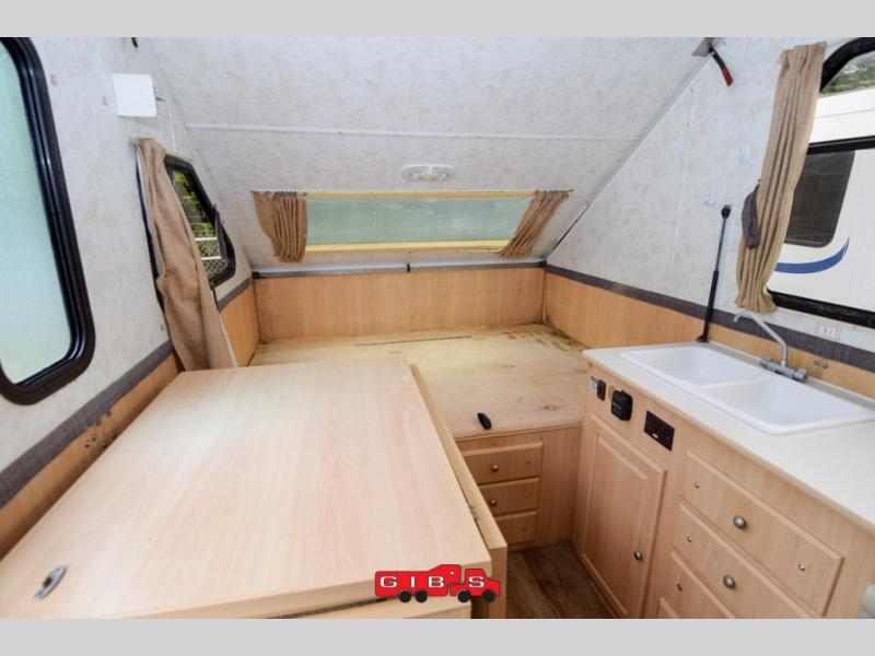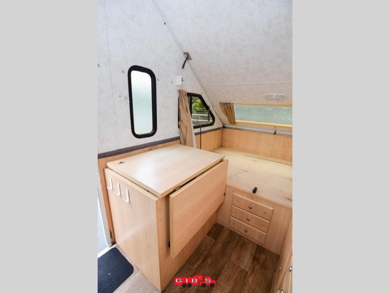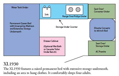 A raised permanent queen bed w/storage below and a place to hang clothes. A dinette/seating area that converts to a 46 inch bed. Standard featured sink, 2 burner range w/3 cu.ft. refrigerator below and optional wet bath (shower, toilet, water heater, and 16 gal. grey water tank).