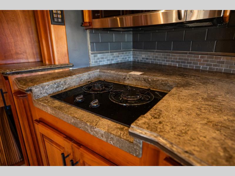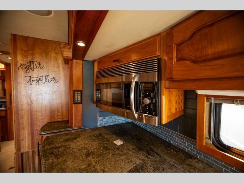 Inside, the quad slide floorplan opens up to a spacious, residential-style living area with high-end materials and craftsmanship throughout. From the premium hardwood cabinetry and solid surface countertops to the plush furnishings, every detail reflects the quality that Country Coach is known for.