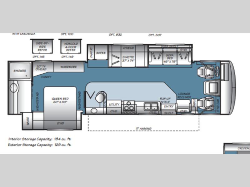 Double Slide, Rear Shower & Large Vanity w/Sink, Wardrobe & Queen Bed w/Nightstands Slideout, Vanity/TV Above, Wardrobe, Pantry/Refrigerator/Booth Dinette & Sofa Bed Slideout, Lounge Recliner w/Side Table, Flip Up Entry Shelf, Double Kitchen Sink, 3 Burner Range, Microwave Above, Utility Cabinet, Engine & Chassis Choice and More.
