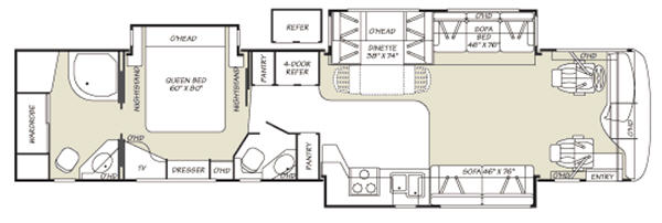 Triple Slide, Lg. Rear Bath w/Wardrobe, Lav., Angle Shower, Queen Bed w/Nightstands, Dresser, TV, Overhead Cabinets, Refrig., Pantrys, Booth Dinette w/Table Extension & 2 Chairs, Sofa Bed, 2nd Sofa, Double Kitchen Sink, 3 Burner Range and Much More.