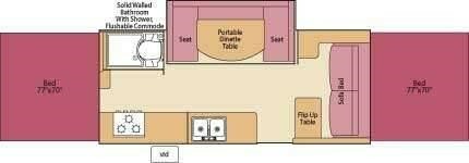 Two King Tent End Beds, Solid Walled Bathroom w/Shower & Flushable Commode, Slideout Portable Dinette Table, Sofa Bed, Flip-Up Table, Double Kitchen Sink, 3 Burner Range, Outdoor RVQ Grill and More.