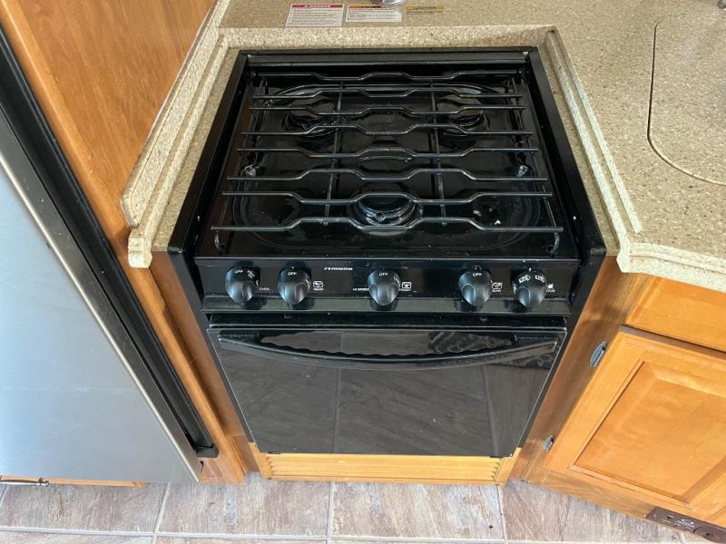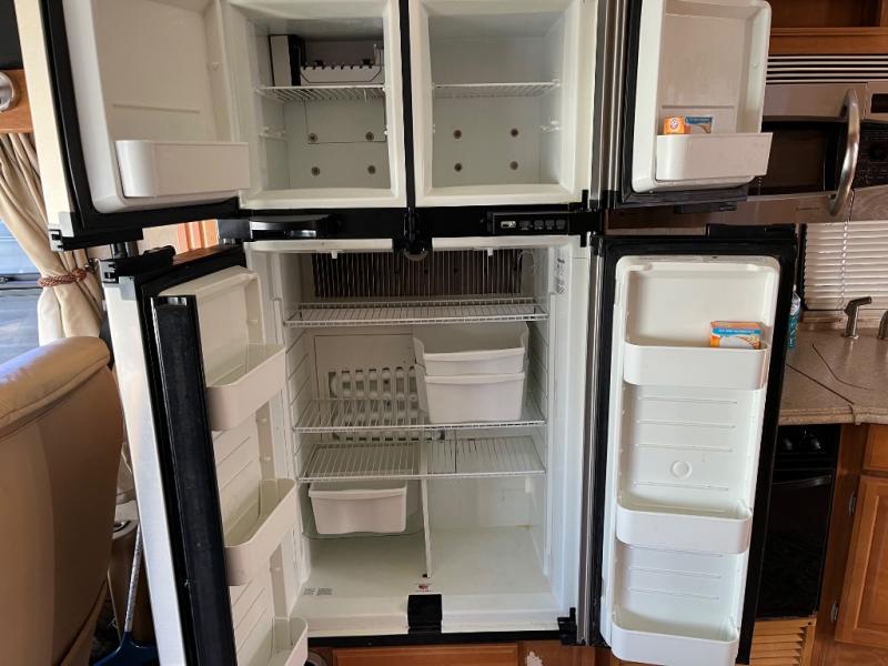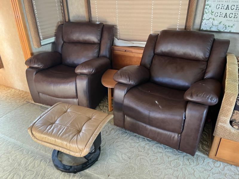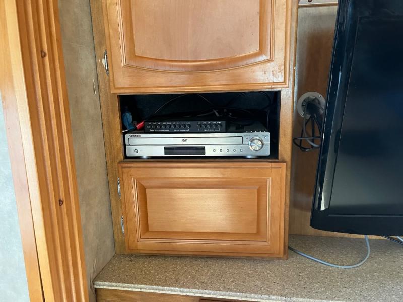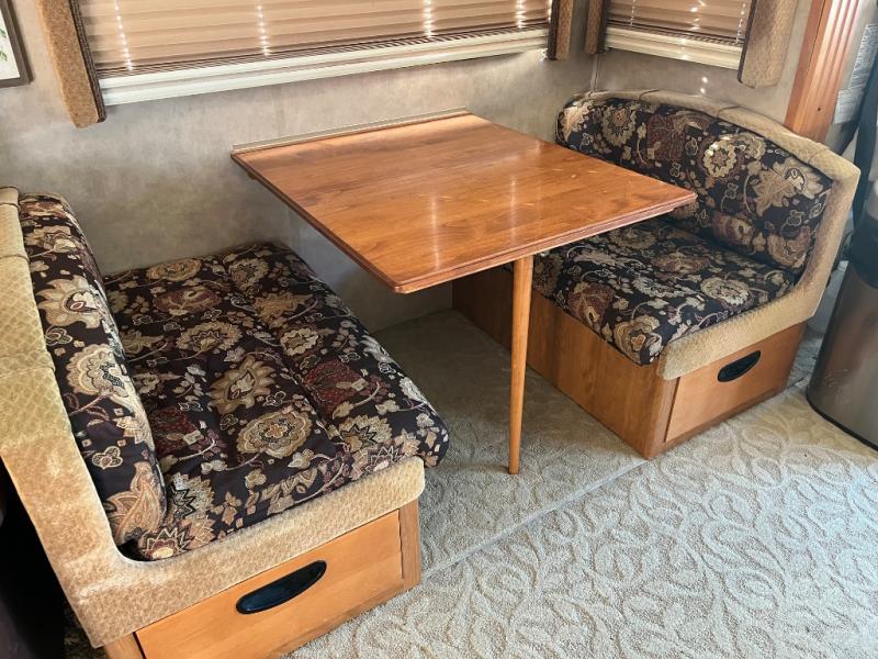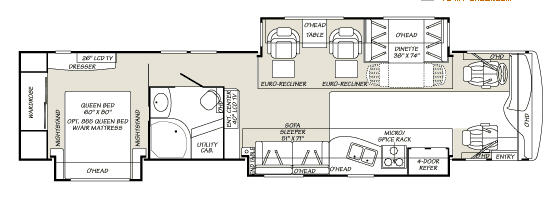 Triple Slide, Rear Queen Bed Slide w/Overhead Cabinet, Dresser, LCD TV, Wardrobe, Side Isle Bath w/Angle Shower, Lav., Utility Cabinet, Med. Cabinet, Sofa Sleeper, Dbl. Kitchen Sink, 3 Burner Range, Microwave, Spice Rack, 4 Door Refrig., Booth Dinette w/Extension & Chairs, 2 Euro Recliners & More.