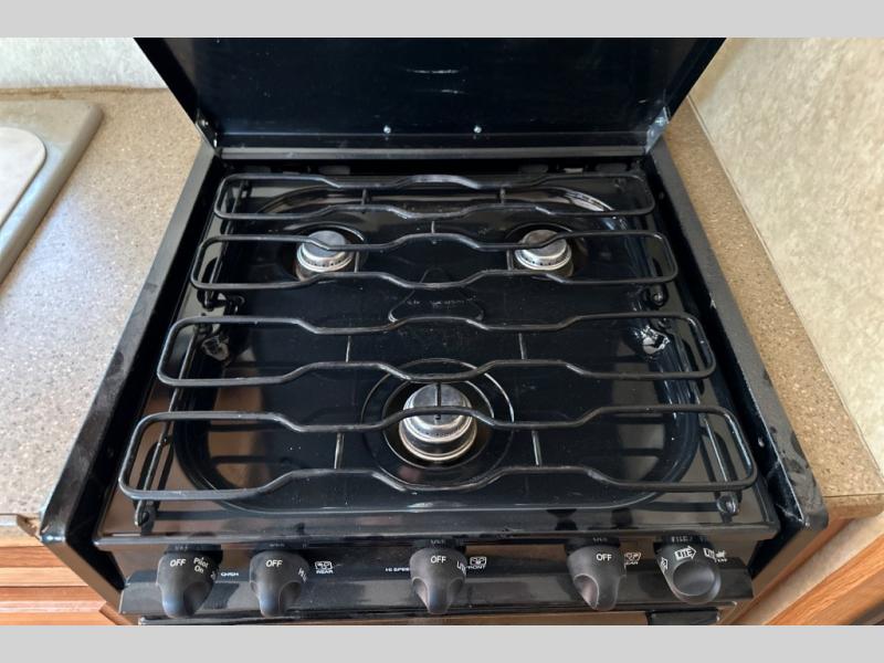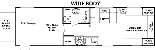7 Ft. Ramp w/Spring Assist, 10 Ft. x 8.2 Ft. Toy Hauling Cargo Space w/Overhead Queen Bunk, Refrigerator, 3 Burner Range, Double Kitchen Sink, Tub/Shower, Medicine Cabinet, Booth Dinette, TV Shelf, Front Queen Bed w/Storage Underneath, Wardrobes w/Drawers, Double Side Entry and More.