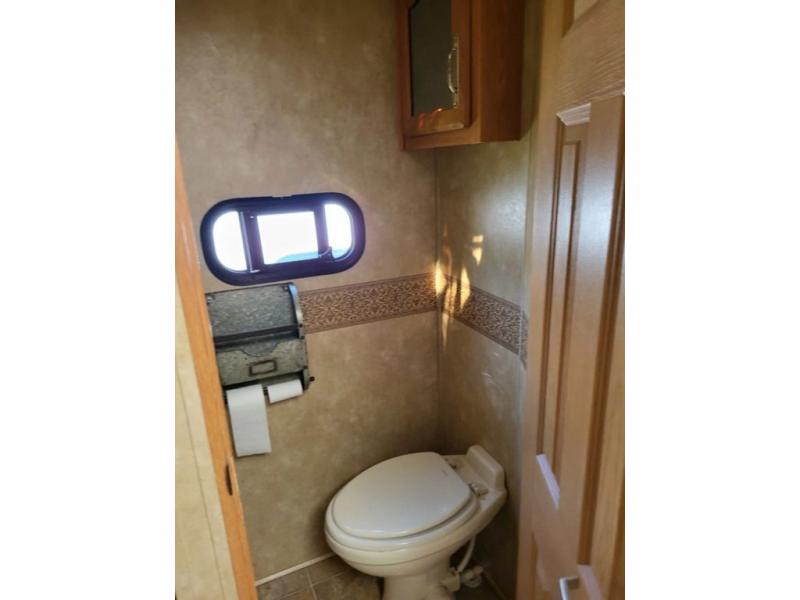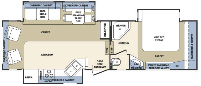 Triple Slide, Rear Living w/2 Recliners, Sofa, Booth Dinette w/Opt. Free-Standing Table & Chairs, Refrigerator, 3 Burner Range, Pantry, Microwave, Double Kitchen Sink, Ent. Center, Step Up to Bed/Bath, Angle Shower, Separate Stool Room, King Bed Slideout, Full End Wardrobe, TV, Vanity, and More.