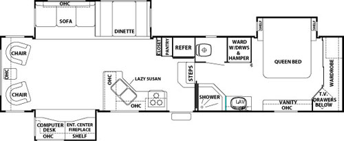 Save Huge 10% OFF ALL NEW UNITS! up to 3000.00 instant savings on select unitsRear Living Space w/2 Chairs & End Table, Computer Desk, Ent. Center/Fireplace/Shelf, Sofa, Dinette, Double Kitchen Sink, Lazy Susan, 3 Burner Range, Refrigerator, Pantry, Closet, Shower, Wardrobe w/Drawers & Hamper, Queen Bed Slide, Vanity, TV/Drawers Below, Full Front Wall Wardrobe and More.