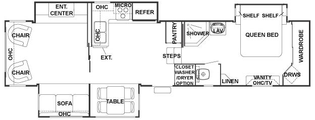 Triple Slide Out, Rear Living Room, Two Chairs, Ent. Center, Sofa Bed, Freestanding Dinette, Kitchen, Double Kitchen Sink, 3 Burner Range, Refrigerator, Microwave, Pantry, Bathroom, Front Bedroom, Queen Bed, Wardrobe, and More.