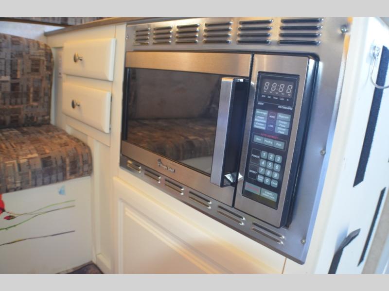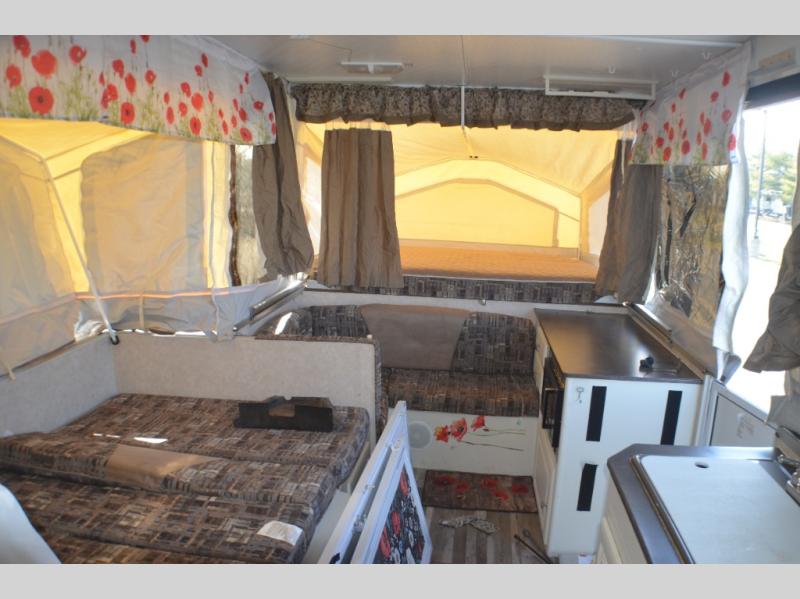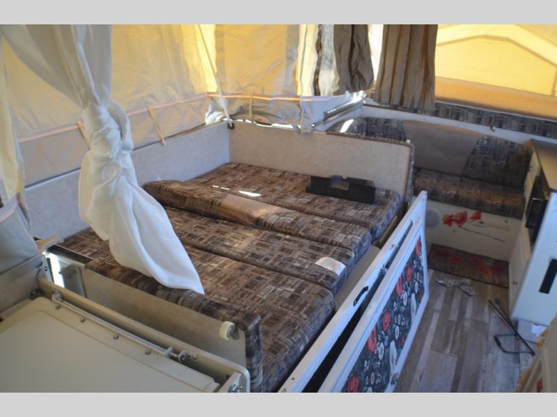 Rear Queen & Front King Tent End Beds, Slideout Booth Dinette, Opt. Funace & Refrigerator, Double Kitchen Sink, Microwave, 3 Burner Stove w/Oven, L-Bench, Sliding Storage, and More.