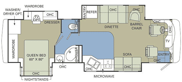 Quad Slide, Rear Queen Bed Slide w/Nightstands, Wardrobes, Opt.TV, Wash/Dryer Opt., Dresser, Angle Shower, Lav., Stool Room, Refrig., 3 Burner Range, Microwave, Double Kitchen Sink, Pantry, Booth Dinette, Sofa, Barrel Chair, TV Above Cab and More.