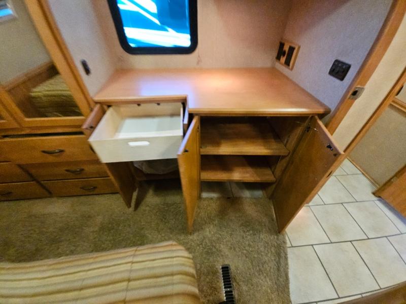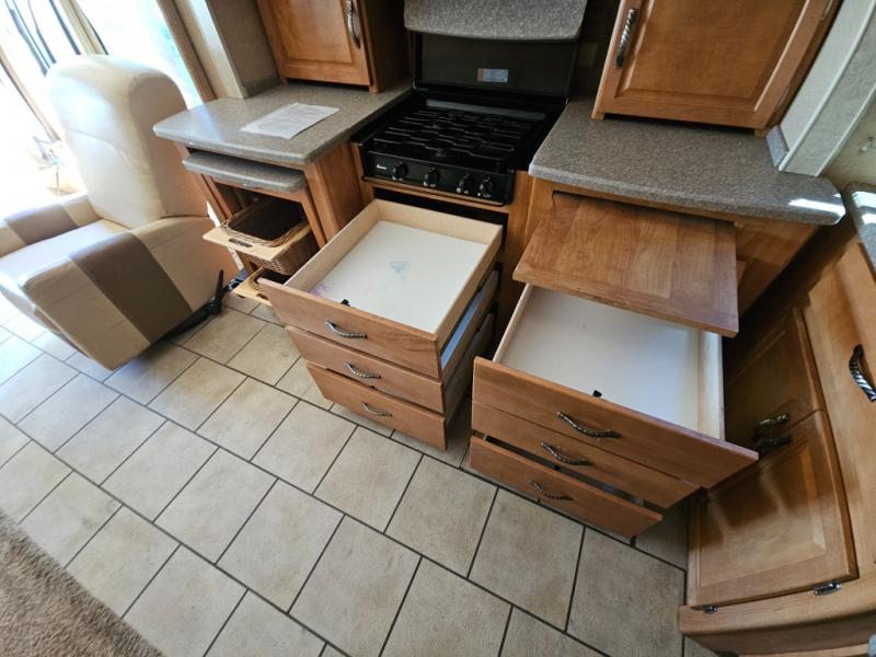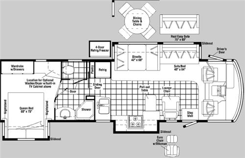 Triple Slide, Queen Bed Slideout, Nightstands, Wardrobe w/Drawers, Opt. Washer/Dryer w/Built-In TV Cabinet, Angle Shower, Refrigerator, Booth Dinette or Table & Chairs, 3 Burner Range, Pull-Out Table, Lounge Chair, Step Well, Sofa Bed or Easy Rest Sofa and More.