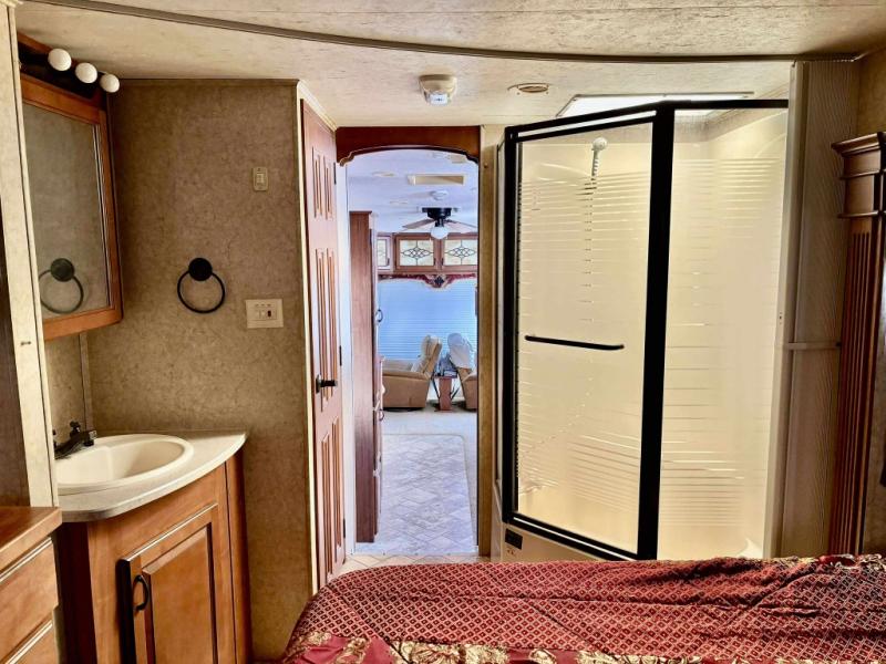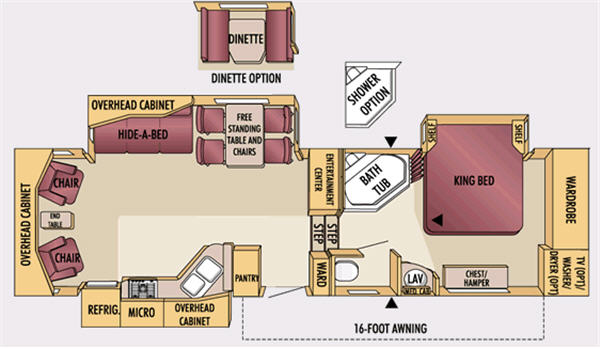 Triple Slide, Rear Living Space w/2 Recliners, End Table, Hide-A-Bed & Free Standing Table & Chairs or Opt. Booth Dinette Slideout, Refrigerator/3 Burner Range & Double Kitchen Sink Slideout, Pantry, Ent. Center, Garden Tub/Opt. Shower, Separate Stool Room, King Bed Slide, Chest/Hamper, Wash/Dryer Opt. & More.