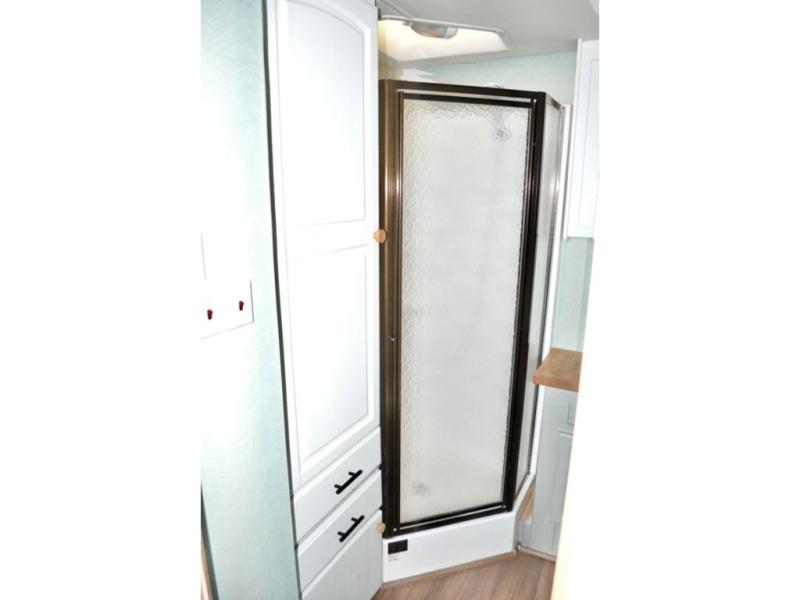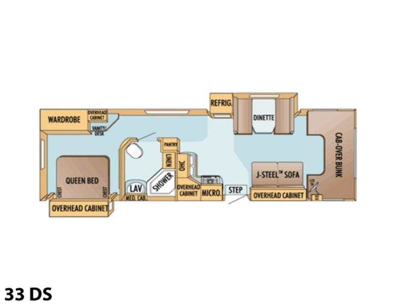 Double Slide, Rear Queen Bed Slideout w/Chests, Wardrobe, Vanity/Desk, Side Isle Bath w/Angle Shower, Lav., Med. Cabinet, Linen Closet, Pantry, Double Kitchen Sink, 3 Burner Range, Refrig. & Booth Dinette Slide or J-Steel Sofa & Sofa Table, J-Steel Sofa, LCD TV, Cab Over Bunk or Opt. Ent. Center & More.