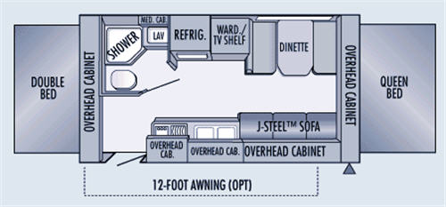 Double & Queen Tent End Beds, Angle Shower, Medicine Cabinet, Refrigerator, Wardrobe/TV Shelf, Booth Dinette, Overhead Cabinet, J-Steel Sofa, Double Kitchen Sink, 3 Burner Range, and Much More.
