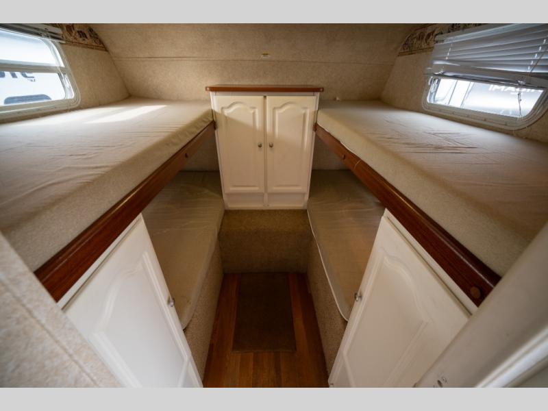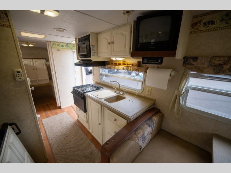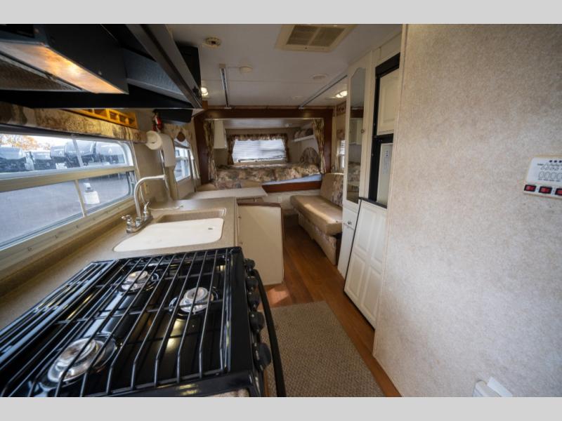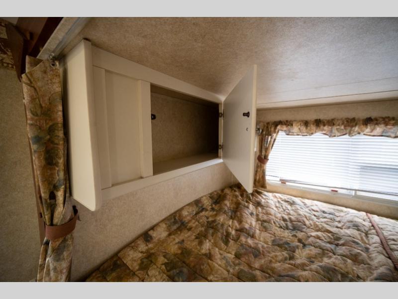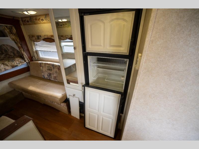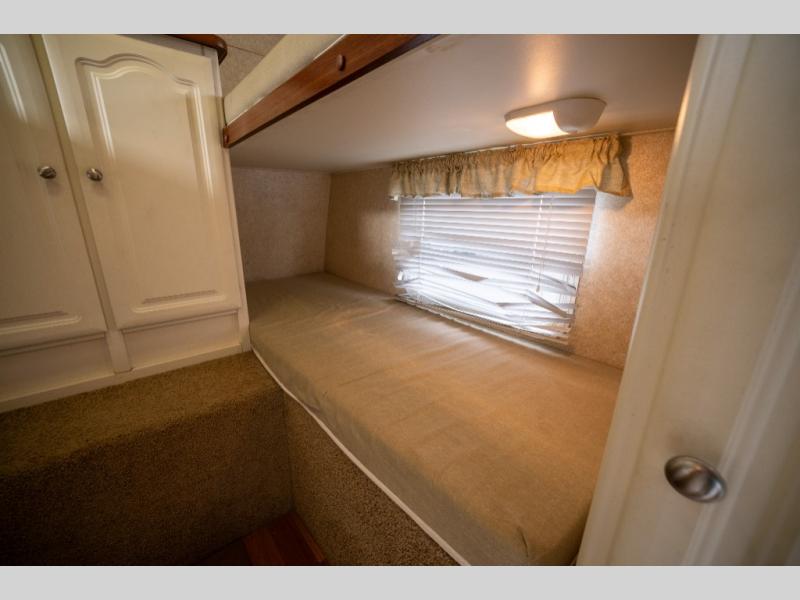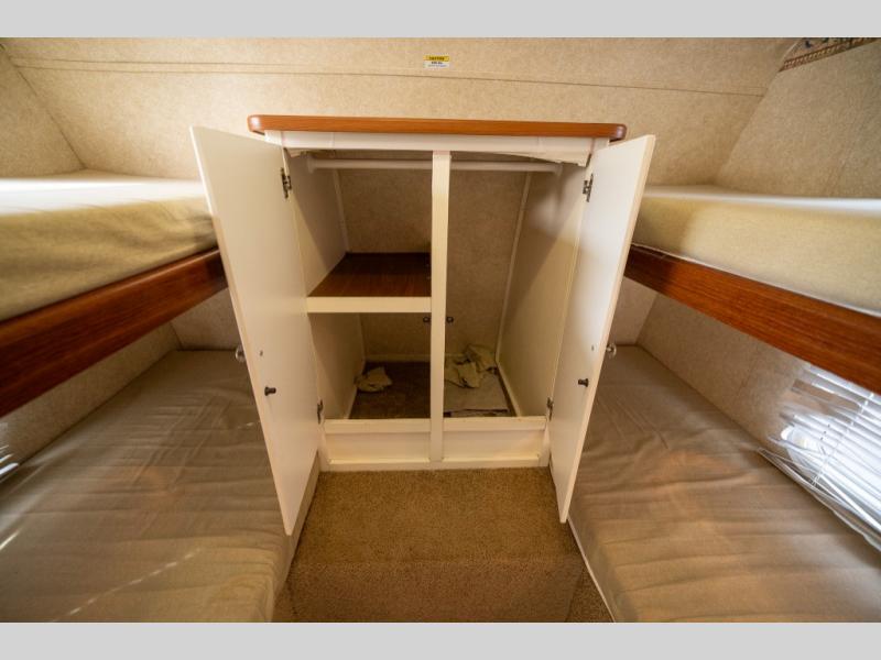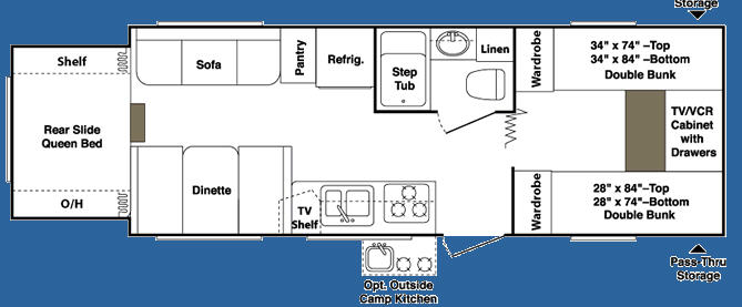 Rear Slide Queen Bed, Sofa, Booth Dinette, TV Shelf, Double Kitchen Sink, 3 Burner Range, Refrigerator, Pantry, Step Tub, Linen Closet, Outside Camp Kitchen, Wardrobes, Front Double Bunks w/TV Entertainment Center Between, Pass-Thru Storage and More.