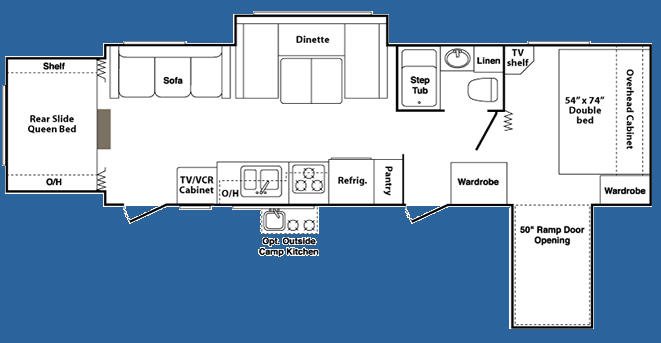Double Slide, Rear Queen Slide w/Shelf & Overhead Cabinet, Sofa, U-Shaped Dinette, TV/VCR Cabinet, Double Kitchen Sink, 3 Burner Range, Refrigerator, Pantry, Opt. Outside Camp Kitchen, Step Tub, Linen Cabinet, TV Shelf, Wardrobe, Front Double Bed w/Overhead Cabinet, Wardrobe, 50' Ramp Door Opening and Much More.