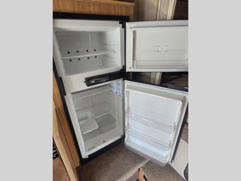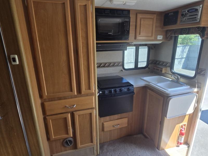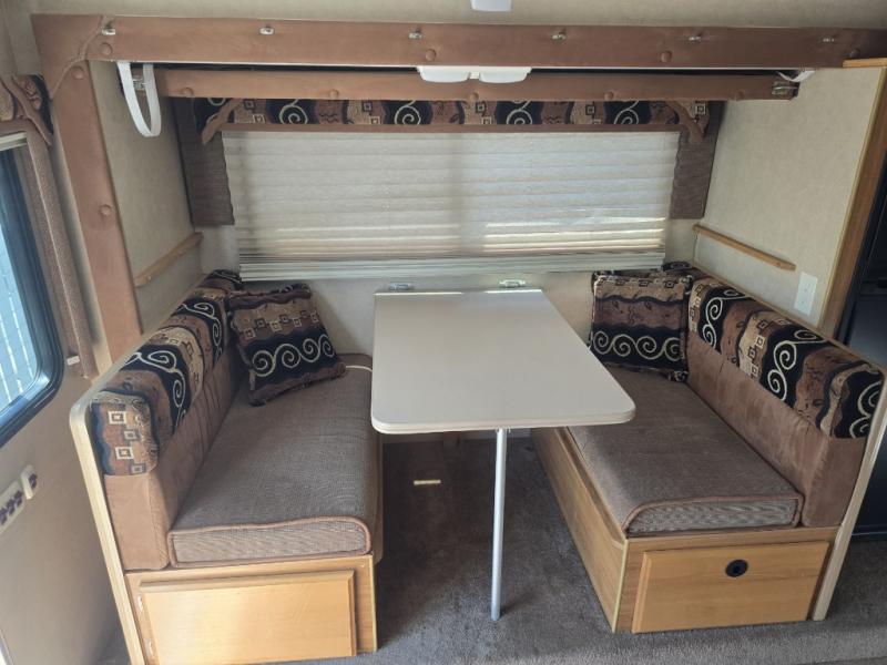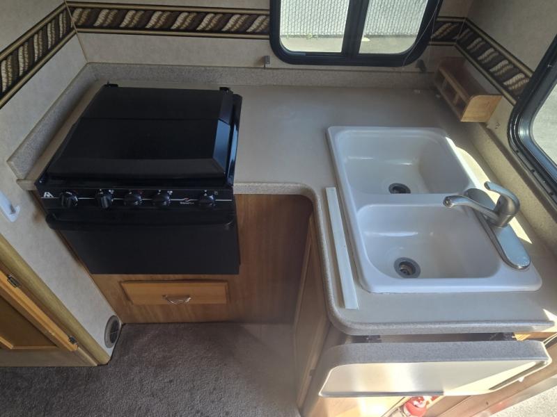 Rear Kitchen w/Double Kitchen Sink, 3 Burner Range, Overhead Cabinets, Refrigerator, Wet Bath w/Shower & Toilet, Booth Dinette Slideout, Mirrored Wardrobe, Queen Cabover Bed, Opt. Fold-Down Bunk, Nightstand and More. Extended Cabover Only.