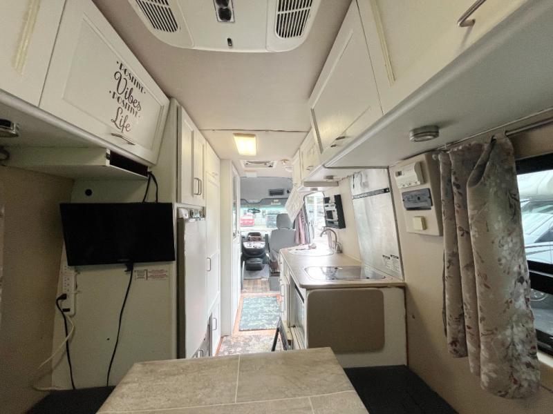 In the rear enjoy a sofa that stretches the entire width of the unit providing ample storage above, and along both the road and curb side too. There is also a dining table with bench seats that along with the sofa can seat four for a meal. You can convert it into a spacious and comfortable 68" x 74" queen size bed when it is time to sleep.