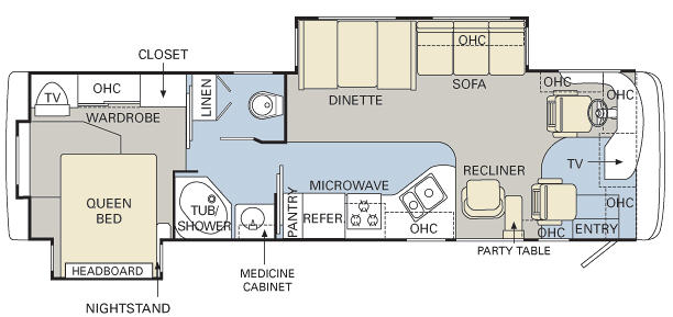 Double Slide, Rear Queen Bed w/Headboard Slideout, Wardrobe/Closet/TV, Angle Shower, Medicine Cabinet, Seperate Stool Room w/Linen Cabinet, Pantry, Refrigerator, 3 Burner Range w/Microwave, Double Sink, Recliner, Party Table, Booth Dinette & Sofa Slide, TV Above Cab Area & More.