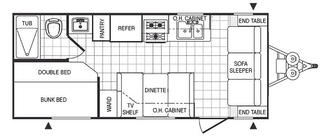 Rear Corner Bath, Tub/Shower, Pantry, Refrigerator, 3 Burner Range, Double Kitchen Sink, End Tables and Sofa-Sleeper, Booth Dinette, Overhead Storage, Bunk w/Lower Double Bed and Much More!