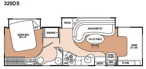 Double Slide Leprechaun Motor Home by Coachmen, Rear Queen Bed Slideout w/Nightstand, Wardrobe, LCD TV, Shower, Private Toilet Area w/Lav., Refrig. & J-Sofa/Dinette Slideout w/Hi-Lo Table, Skylight, Bunk Over Cab Area, TV Cabinet, Euro Chair, Kitchen Sink, 3 Burner Range, Overhead Cabinets Throughout and More.