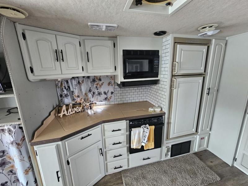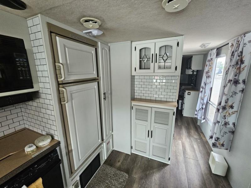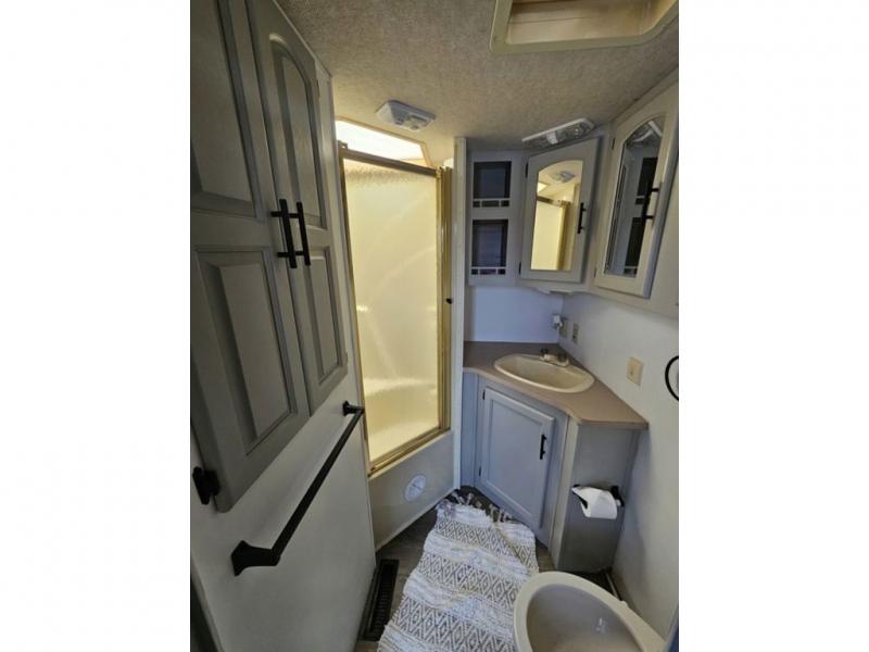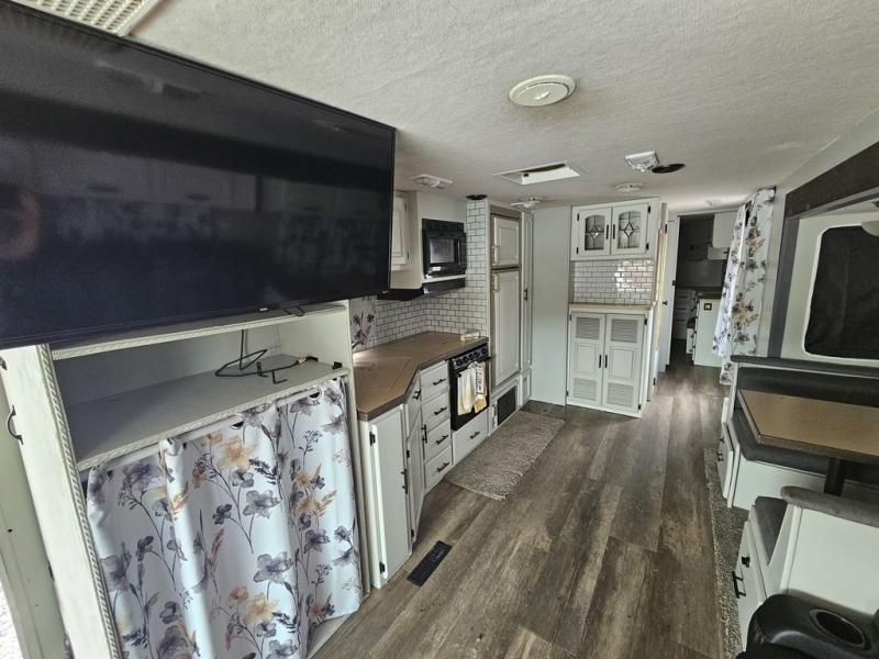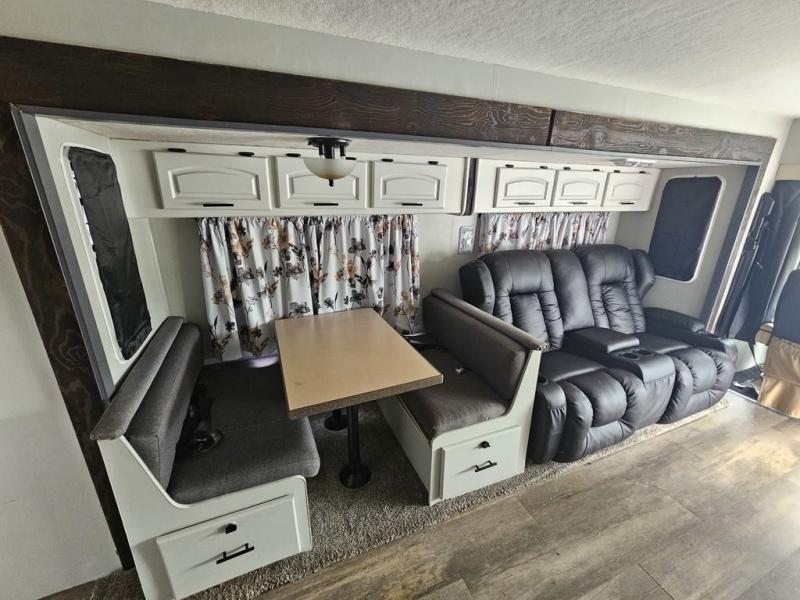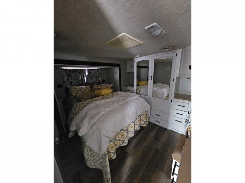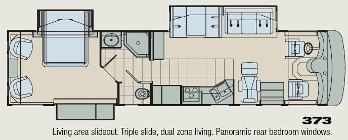Rear Queen Bed Slideout, 2 Barrel Chairs w/End Table in Bedroom, Wardrobe Slideout, Seperate Stool Room, Angle Shower, Booth Dinette & Hide-A-Bed Slideout w/Seatbelts, Lounge Chair w/Ottoman, Double Kitchen Sink, 3 Burner Range, Refrigerator, Double Kitchen Sink, Pantry and More.