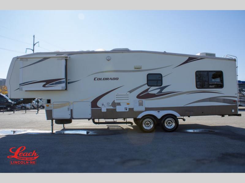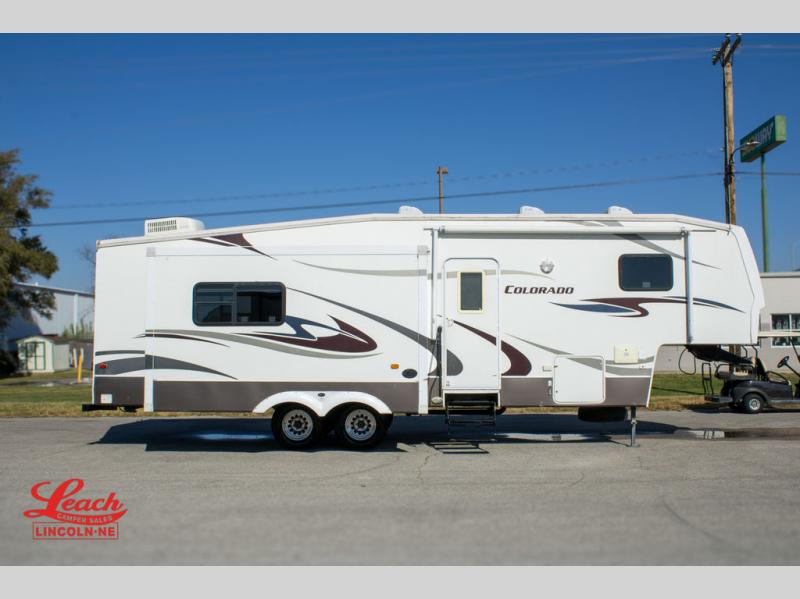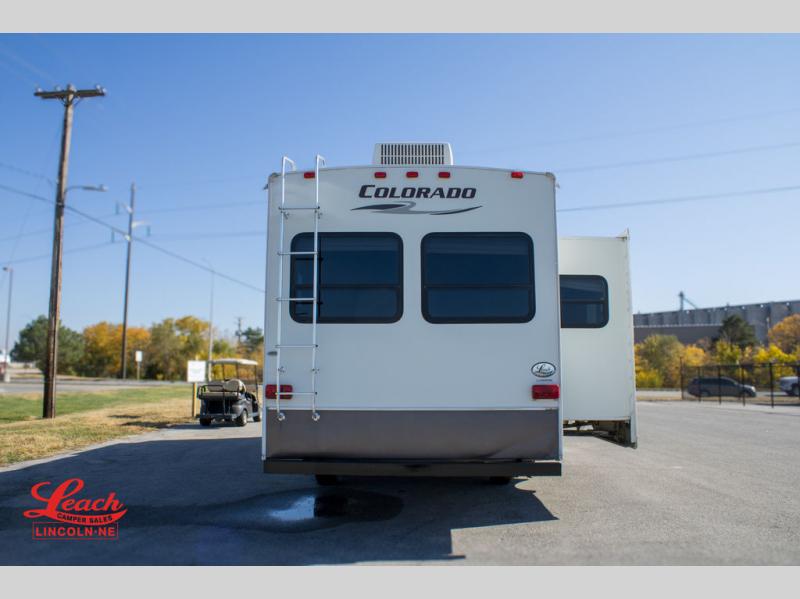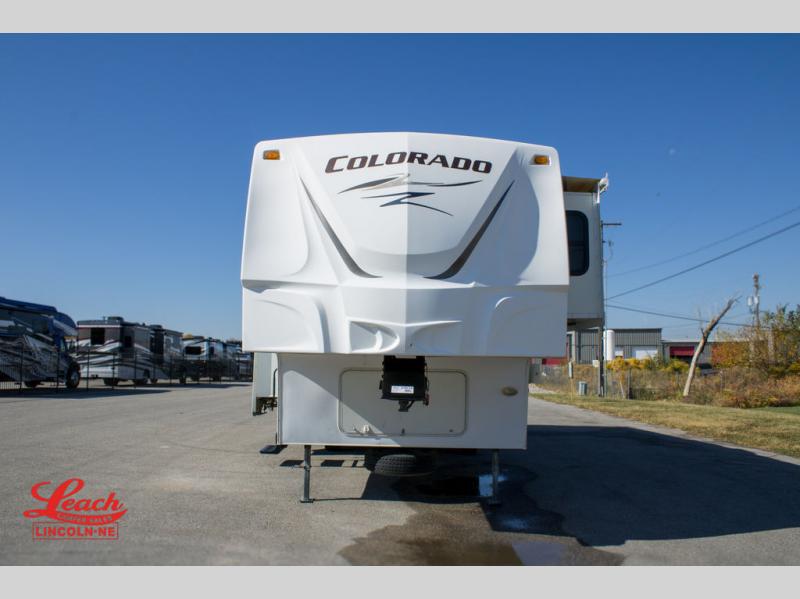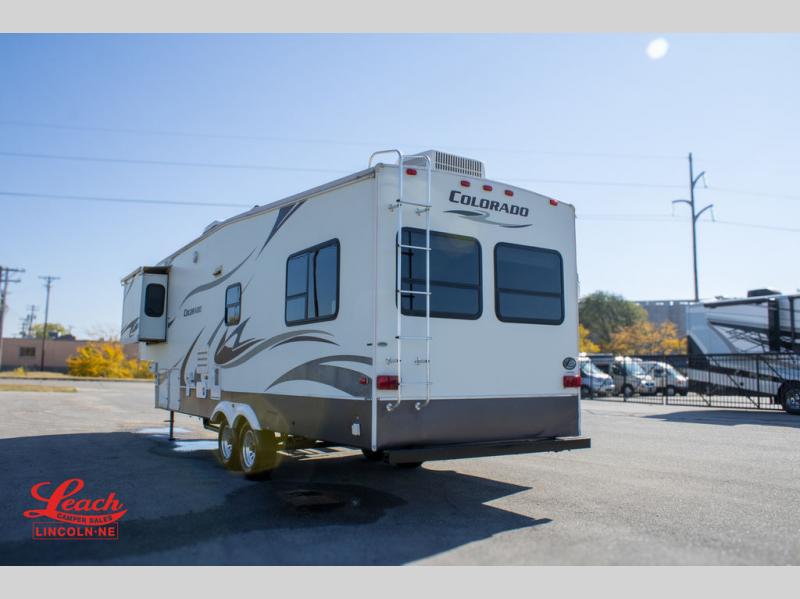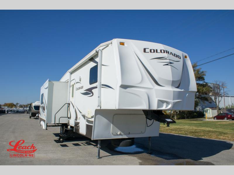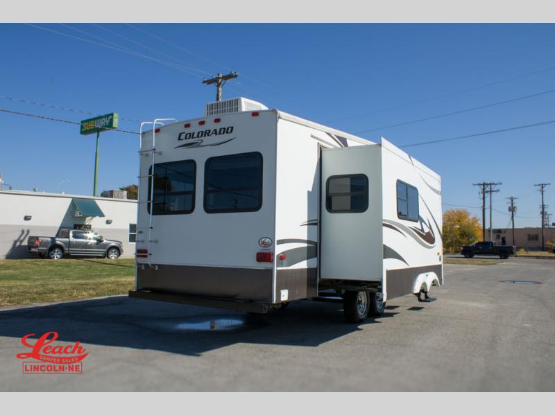 Double Slide Colorado Fifth Wheel w/Rear Living Area Including Sectional Sofa w/Overhead Cabinets, Slideout Sofa/Dinette w/Table & Ent. Center, 2 Bar Stools, Double Kitchen Sink, 3 Burner Range, Refrigerator, Ceiling Fan, Side Aisle Bath w/Corner Shower, Lav., Linen Cabinet, Double Bath Entrance, Front Queen Bed w/Nightstands Slide, Wardrobe, TV Cabinet, Dresser and Much More.