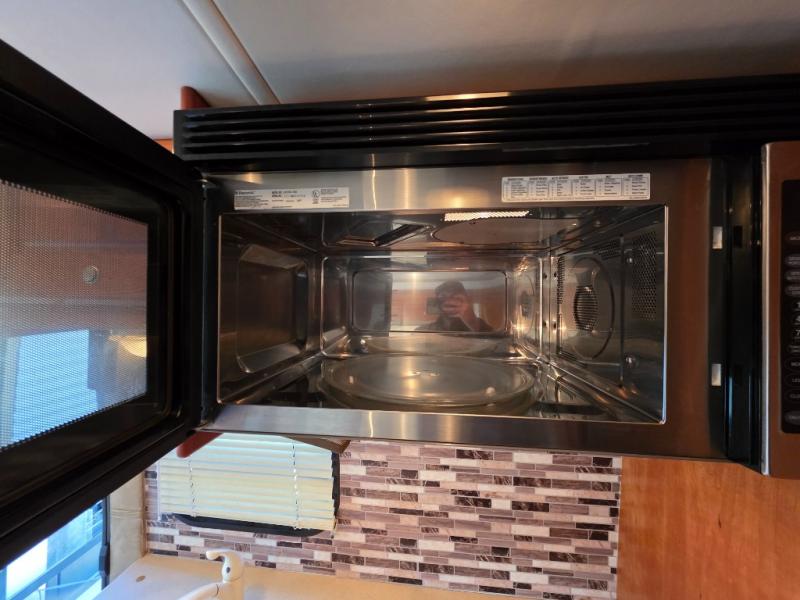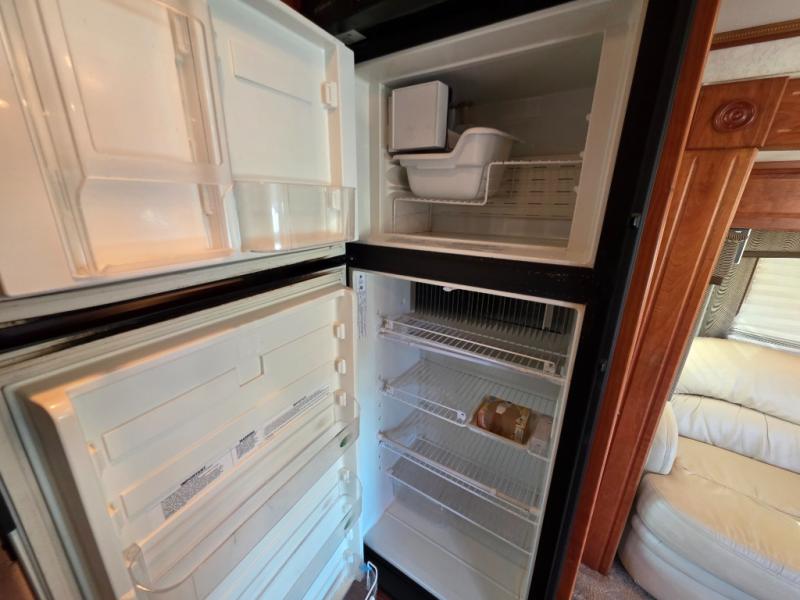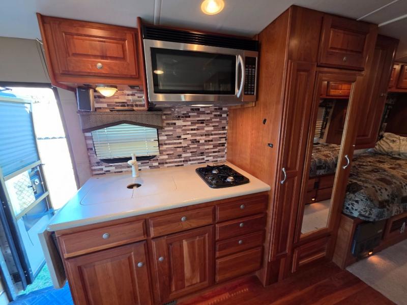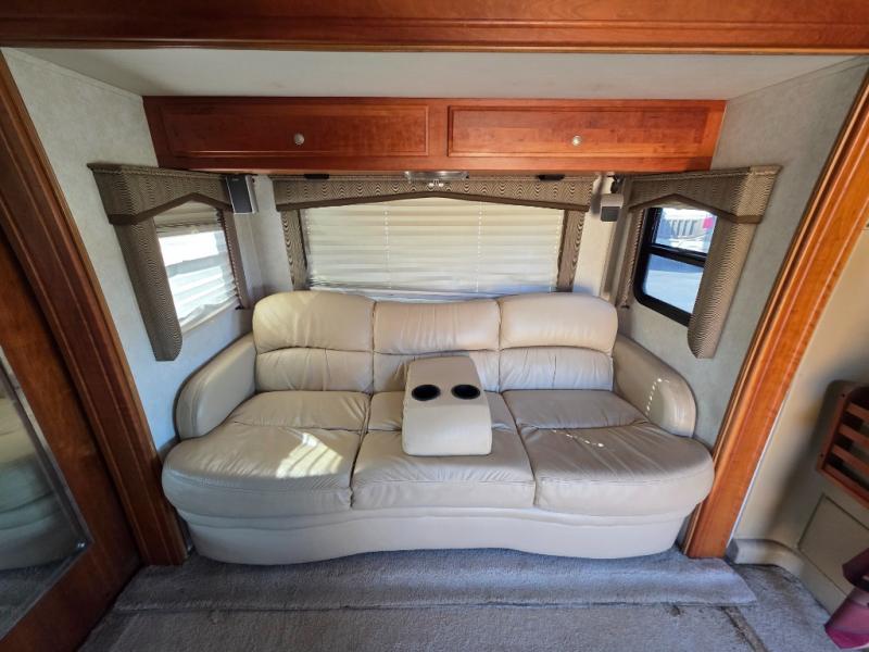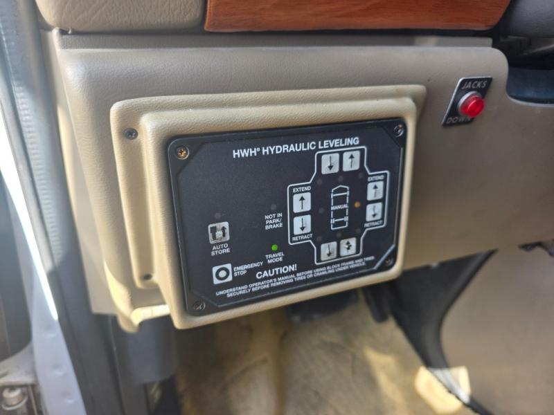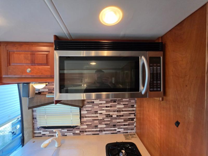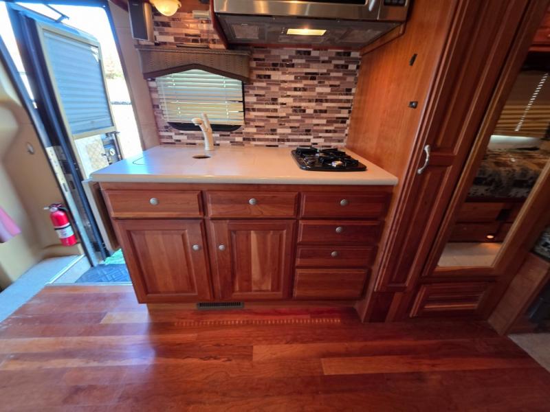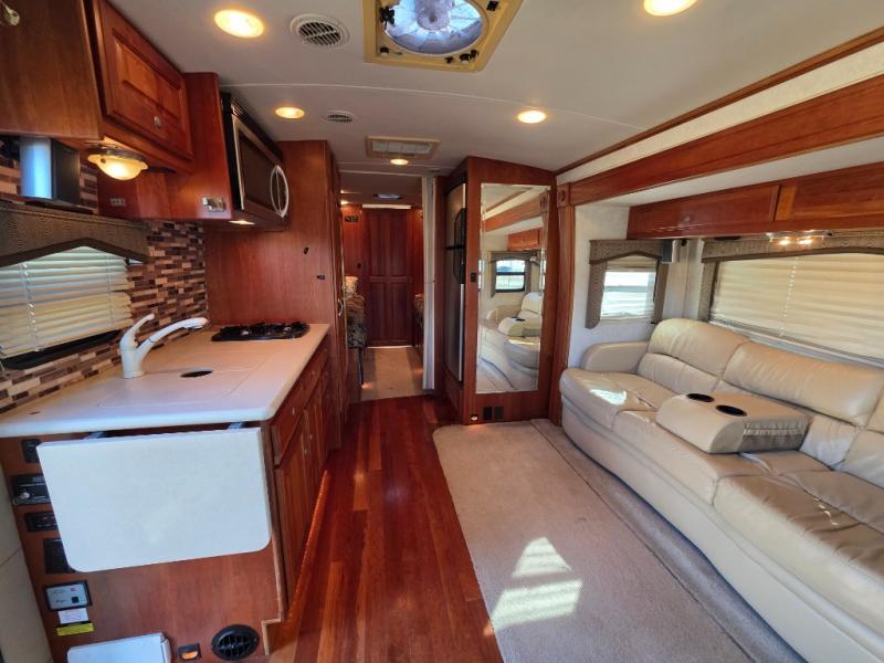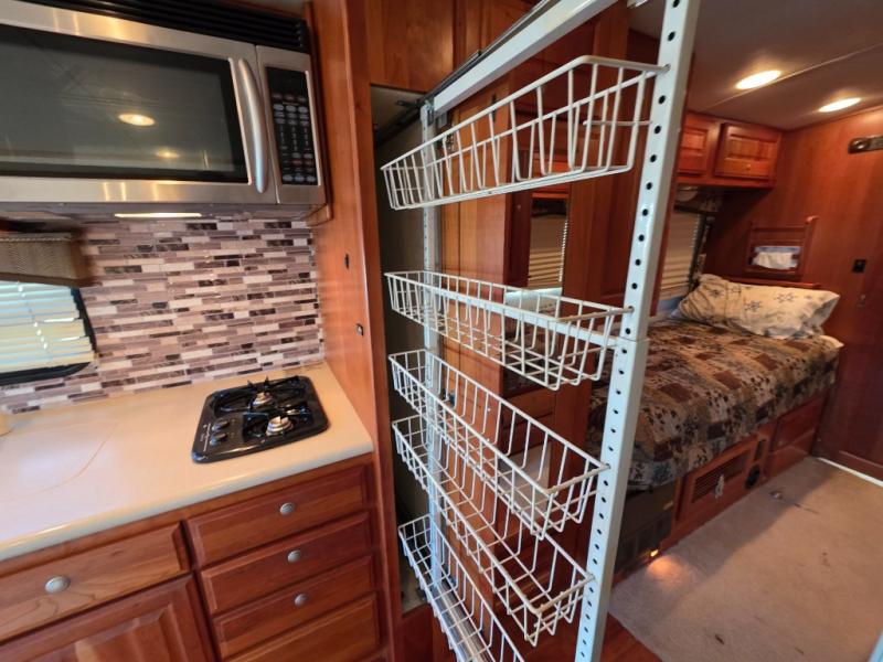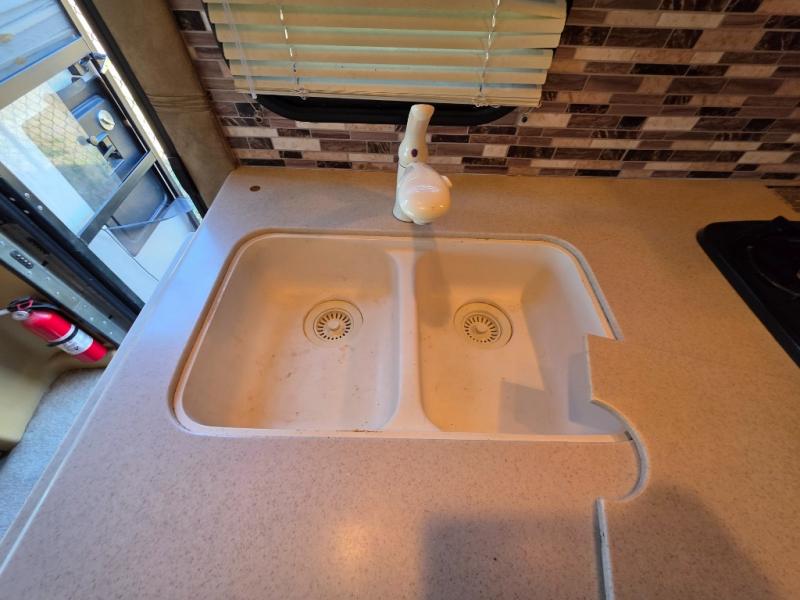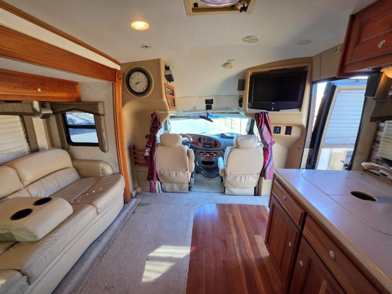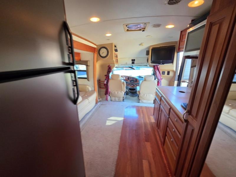 As you enter the motor home, to the left there is a double kitchen sink, two burner range, microwave, pantry, and wardrobe. On the opposite side you will find an easy bed sofa slide with two sofa tables. Next to the slide is the refrigerator. In the front overhead you will find a LCD TV, which you are sure to enjoy.