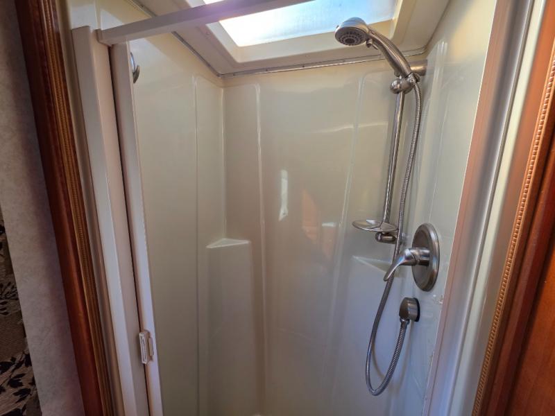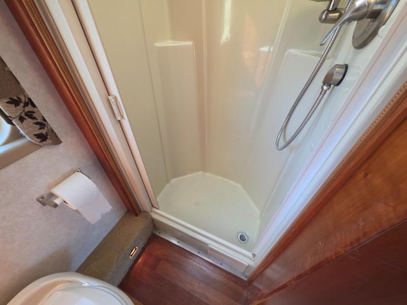 In the rear, is the bathroom. You will find a shower, toilet, sink, and linen cabinet.