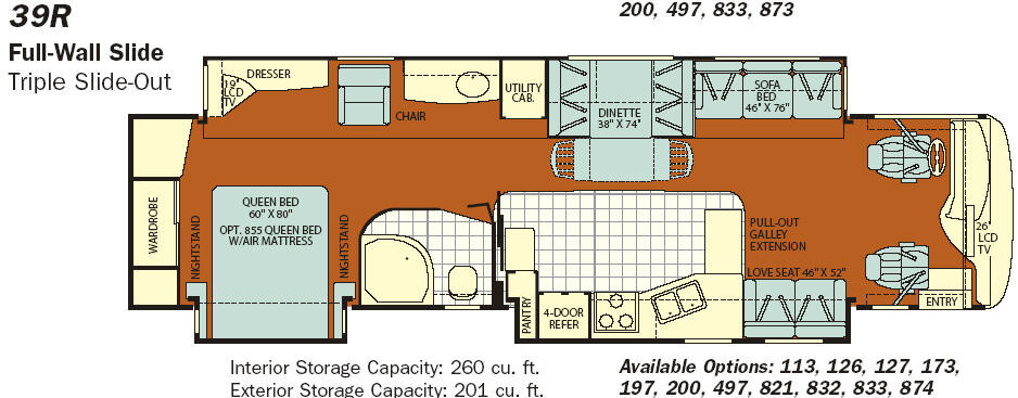 Triple Slide Class A Motorhome w/Full Wall Slide, Rear Queen Bed Slide w/Nightstands or Opt. Queen Bed w/Air Mattress, Wardrobe, Dresser w/LCD TV Above/Chair/Vanity/Utility Cabinet/Booth Dinette w/Extension & 2 Chairs & Sofa Bed Full Wall Slide, LCD TV Above Cab Area, Love Seat/Pull-Out Galley Extension/Dbl. Sink/3 Burner Range/4 Door Refrig. & Pantry Slideout, Angle Shower and Much More.