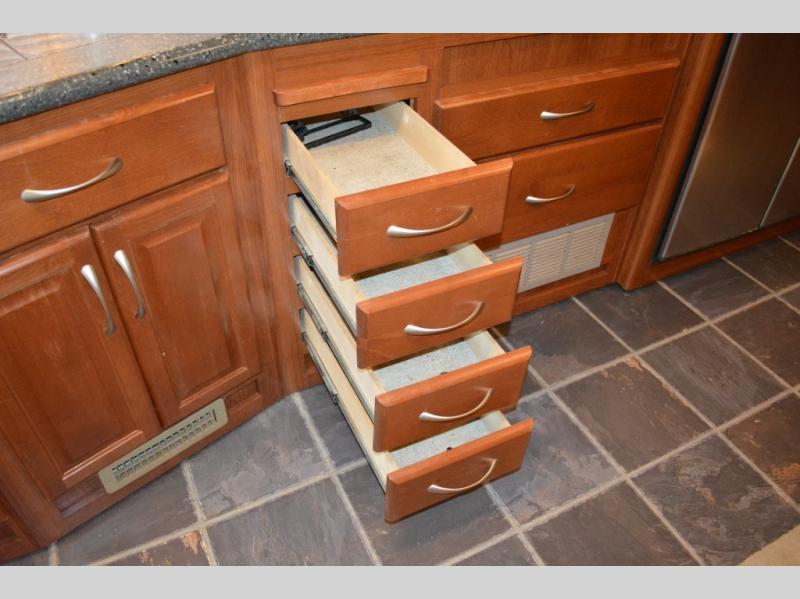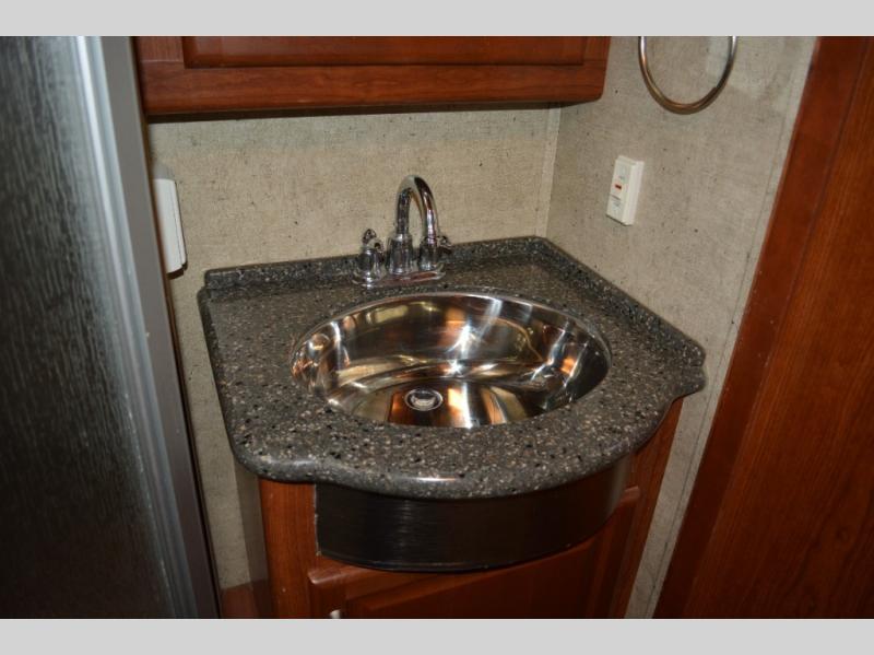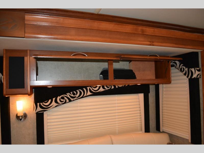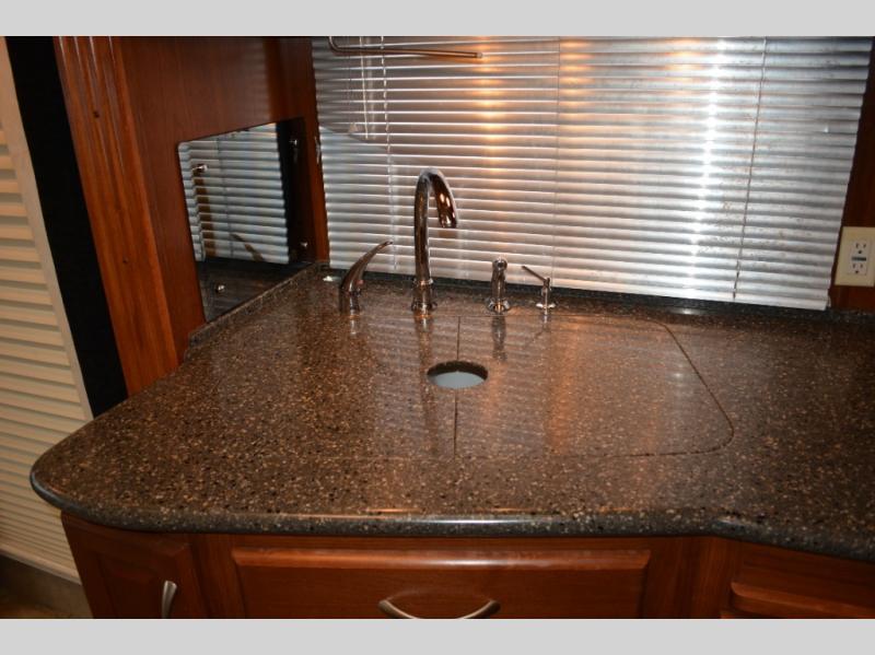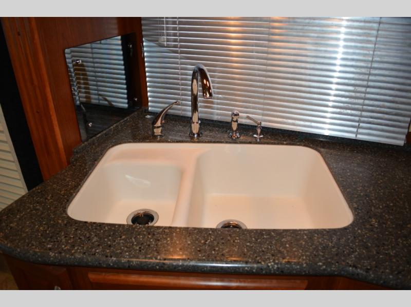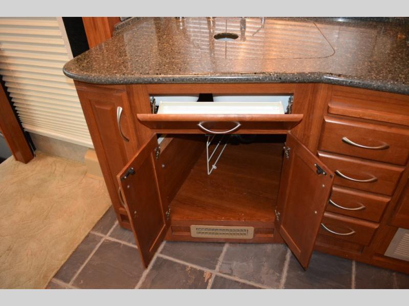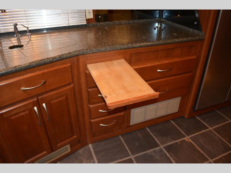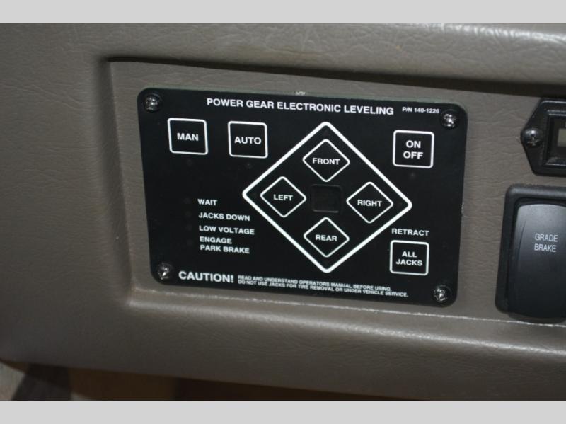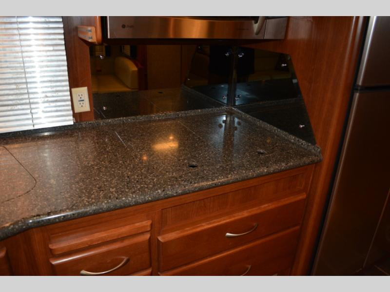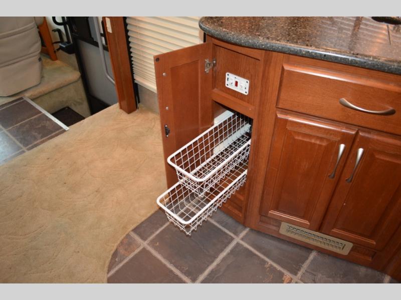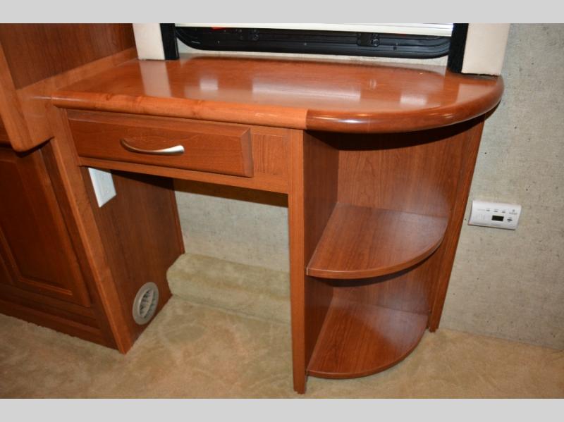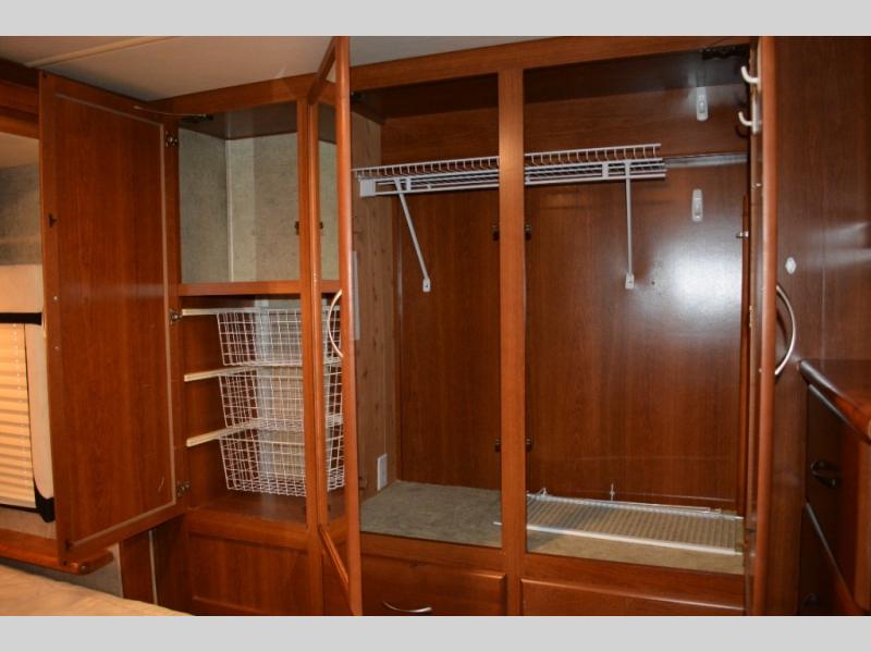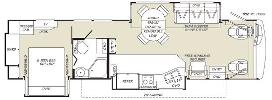 Triple Slide Class A Motorhome w/Rear Bedroom Including a Rear Wardrobe, Storage Cabinet, TV/Desk, Queen Bed Slide w/Nightstands, Side Isle Bath w/Angle Shower, Lav., Double Bath Entrance, Pantry, Utility Cabinet, Refrig./2 Burner Cooktop w/Microwave Above & Double Kitchen Sink Slideout, Recliner, Sofa Bed & Round Dinette w/Chairs Slideout and More. Shown w/Ford Specifications. See us for Workhorse Specs.