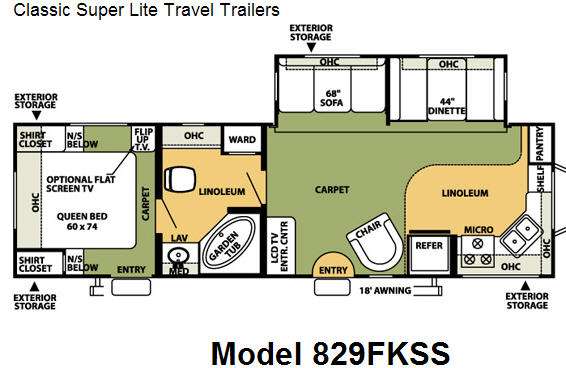 Single Slide, Rear Queen Bed w/Opt. Flat Screen TV, Shirt Closets Above Nightstands, Flip-Up TV, Private Bedroom Entrance, Garden Tub, Lav., Med. Cabinet, Wardrobe, LCD TV/Ent. Center, Sofa & Booth Dinette Slideout, Barrel Chair, Front Kitchen w/Refrigerator, 3 Burner Range, Double Kitchen Sink, Shelf, Pantry, Overhead Cabinets, 18' Awning, Exterior Storage Front & Rear and Much More.