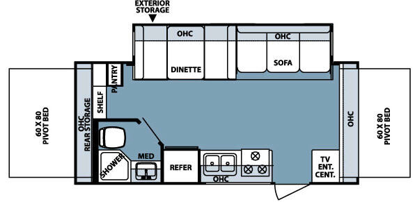 Front & Rear Pivot Tent End Beds, Overhead Cabinets, Rear Storage, Pantry, Angle Shower, Med. Cabinet, Refrigerator, Double Kitchen Sink, TV Ent. Center, Booth Dinette & Sofa Slideout, 3 Burner Range, Exterior Storage and Much More.