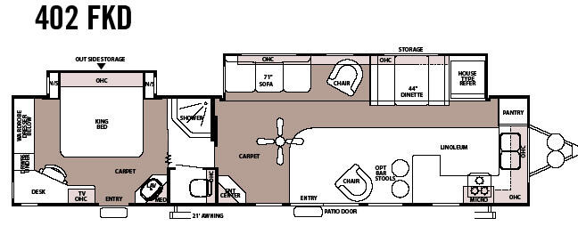 Double Slide w/One Super Slide, Rear King Bed w/Nightstands, Desk, TV< Wardrobe w/Dresser Below, Lav., Med. Cab., Angle Shower, Stool Room, Ent. Center, Sofa, Booth Dinette, Chair, Front Kitchen w/House Type Refrig., Double Kitchen Sink, 3 Burner Range, Opt. Bar Stools, Patio Door and Much More.