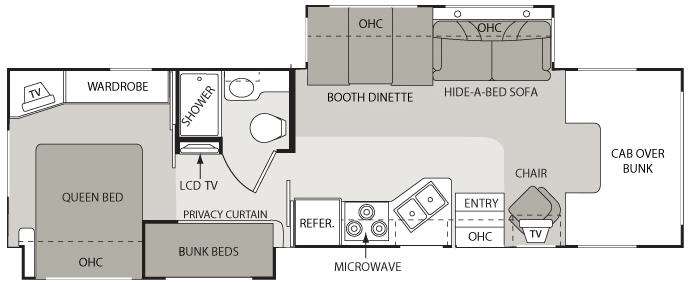 Double Slide Bunkhouse Class C Motor Home. Rear Queen Bed & Bunk Bed Slideout w/Privacy Curtain for Hallway Bunks, Wardrobe, Nightstand, TV for Bedroom & LCD TV for Bunks, Shower, Lav., Overhead Cabinets, Booth Dinette & Hide-A-Bed Sofa Slideout, Cabover Bunk or Opt. Ent. Center Above Cab w/Pull-Out Bunk, Barrel Chair w/TV Above, Double Kitchen Sink, 3 Burner Range w/Microwave, Refrigerator and Much More!