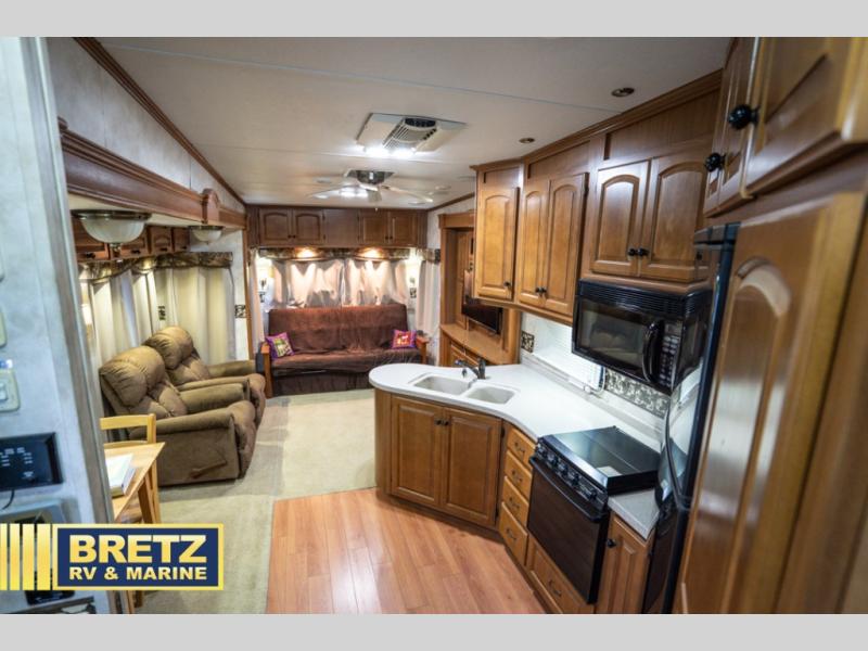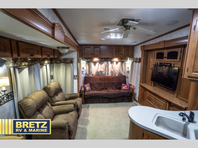 Triple Slide Fifth Wheel, Rear Living w/Two Recliners, Slide Out Ent. Center, Slide Out Sofa Bed/Freestanding Dinette, Double Kitchen Sink, 3 Burner Range, Refrigerator, Pantry, Closet, King Shower, Sink, Private Toilet Area, TV Cabinet/Washer Dryer Ready, Slide Out Wardrobe, Queen Bed w/4 Drawer Under Bed Storage, Nightstands, and More.