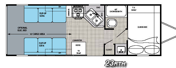 10' Garage! Tub Shower!Toy Hauler Travel Trailer w/Rear Ramp Door Spring Assist, 10 Ft. Cargo Toy Parking Space, Opt. Queen Electric Bed, 2 Flip Sofa's, Drawers, Refrigerator, TV Shelf, 3 Burner Range, Double Kitchen Sink, Microwave, Overhead Cabinets, Shower/Tub, Lav., Closet, Front Queen Bed w/TV Shelf and More.