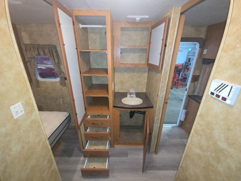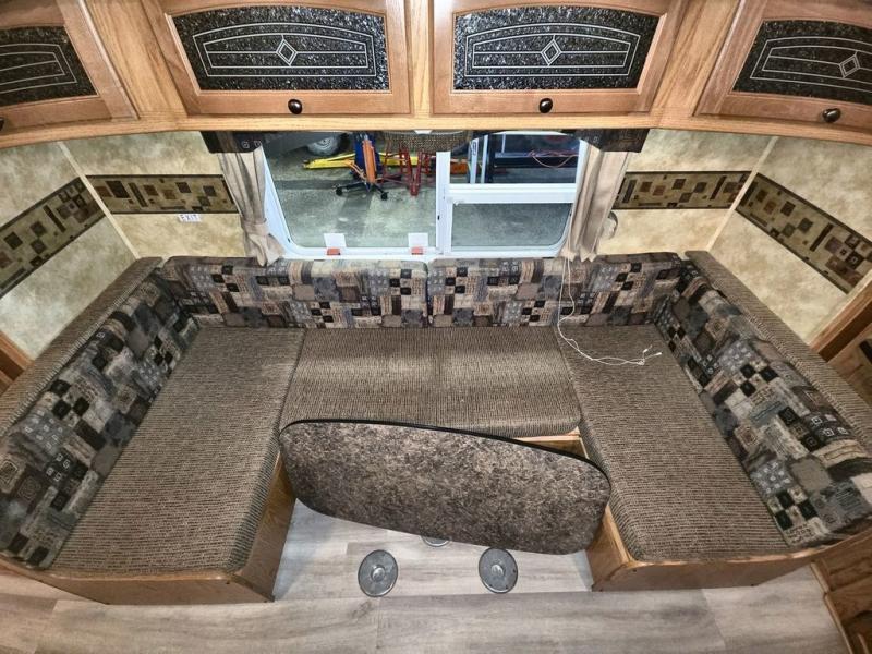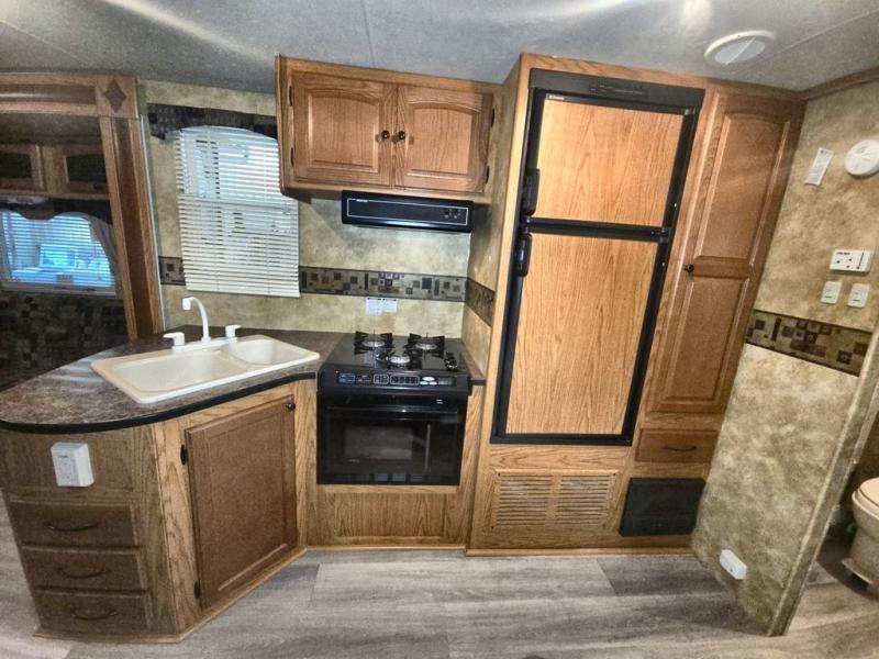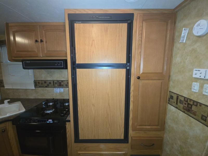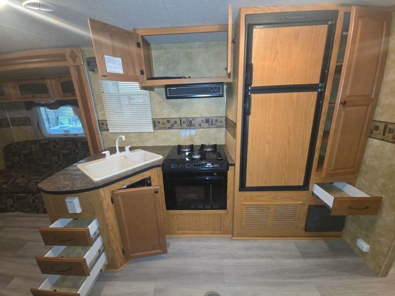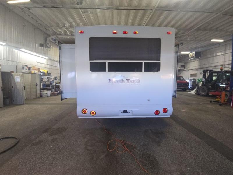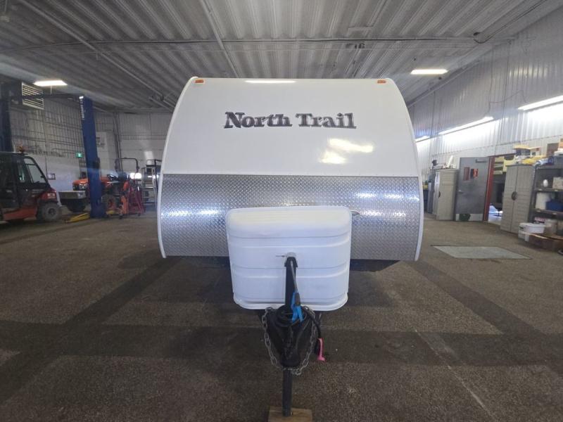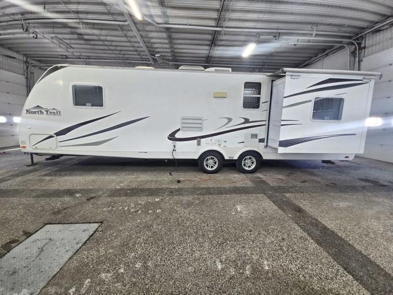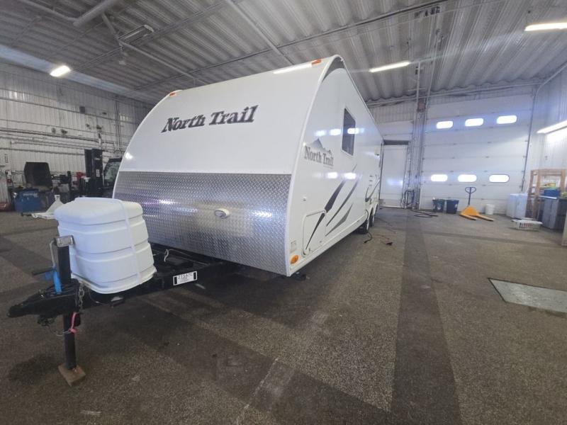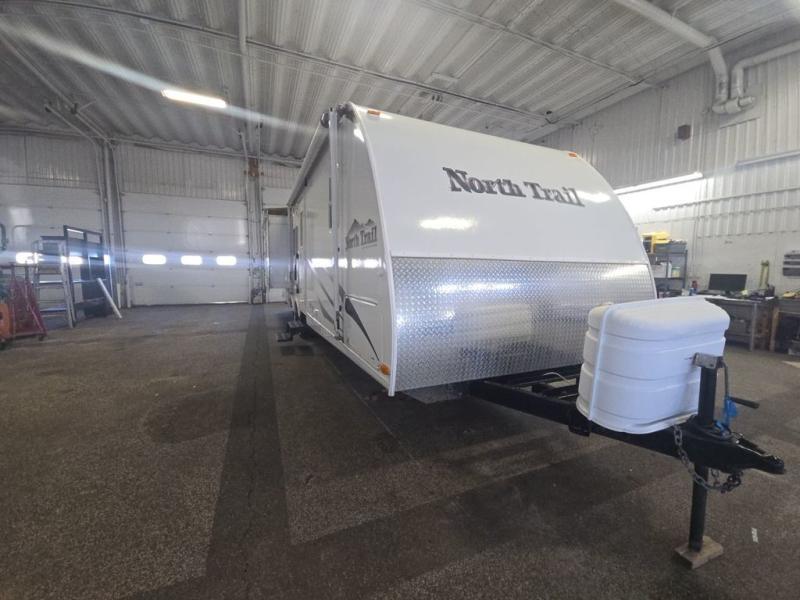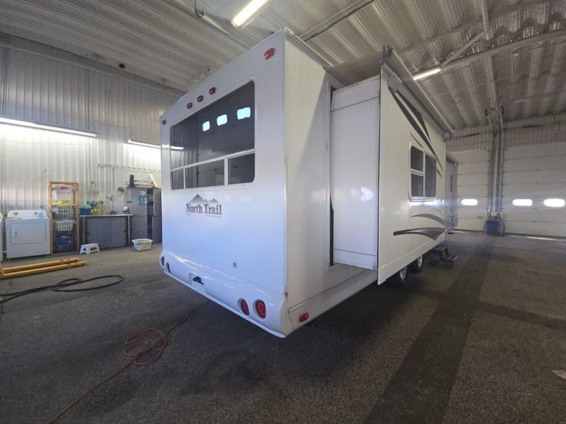 Double Slide North Trail Lightweight Travel Trailer w/Rear Living Area, Full End Wall Entertainment Center, Hide-A-Bed Sofa Slideout, U-Shaped Dinette Slideout, Double Kitchen Sink, 3 Burner Range w/Overhead, Refrigerator, Pantry, Base Cabinet w/Overhead Storage, Linen Closet, Lav., Tub/Shower, Front Queen Bed w/Nightstands Below Shirt Closets and More!