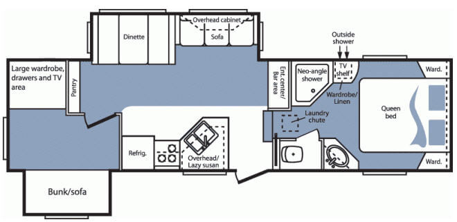 Double Slide Cougar Bunkhouse Fifth Wheel w/Rear Bunk/Sofa Slideout, Large Wardrobe/Drawers & TV Area, Pantry, Booth Dinette & Sofa Bed Slideout, Refrigerator, 3 Burner Range, Double Kitchen Sink, Ent. Center/Bar Area, Step Up To Bed & Bath Area w/Angle Shower, Laundry Chute, Lav., TV Shelf Above Wardrobe/Linen Cabinet, Outside Shower, Front Queen Bed w/Wardrobes and More.