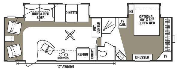 Double Slide Rear Living Area, 2 Lounge Chairs, Overhead Cabinets, End Table, Hide-A-Bed Sofa & Booth Dinette Slideout, Double Kitchen Sink, 3 Burner Range, Refrigerator, Pantry, Ent. Center, Opt. Fireplace, Private Toilet, Angle Shower, Lav., Front Queen Bed w/Nightstand Slideout., Dresser, TV Cabinet, Wardrobe, Awning & Much More.